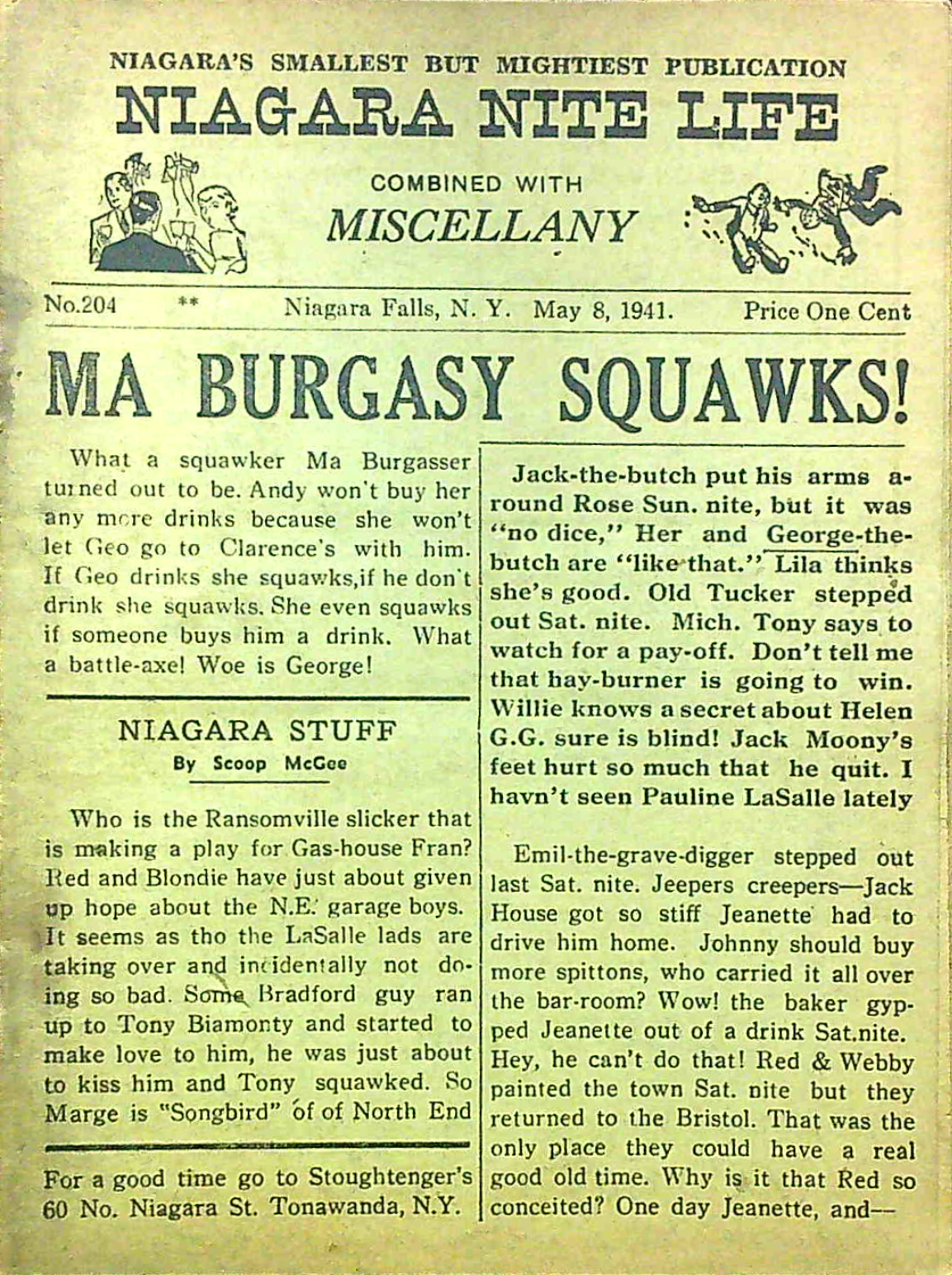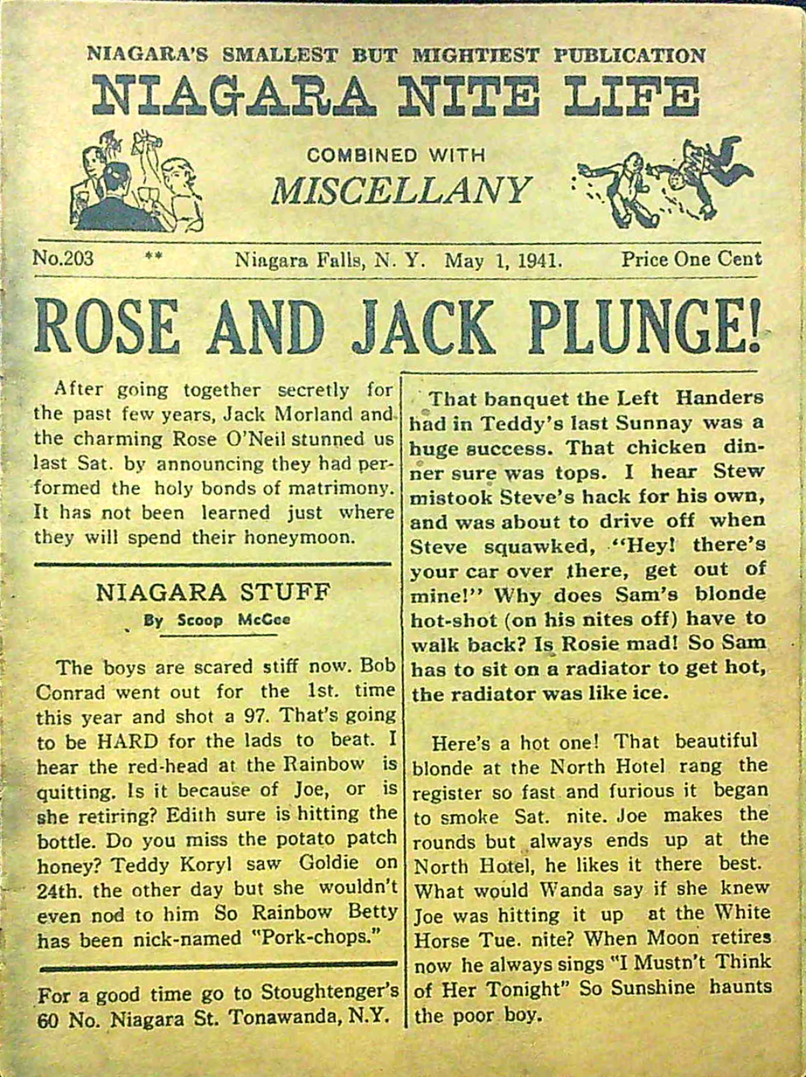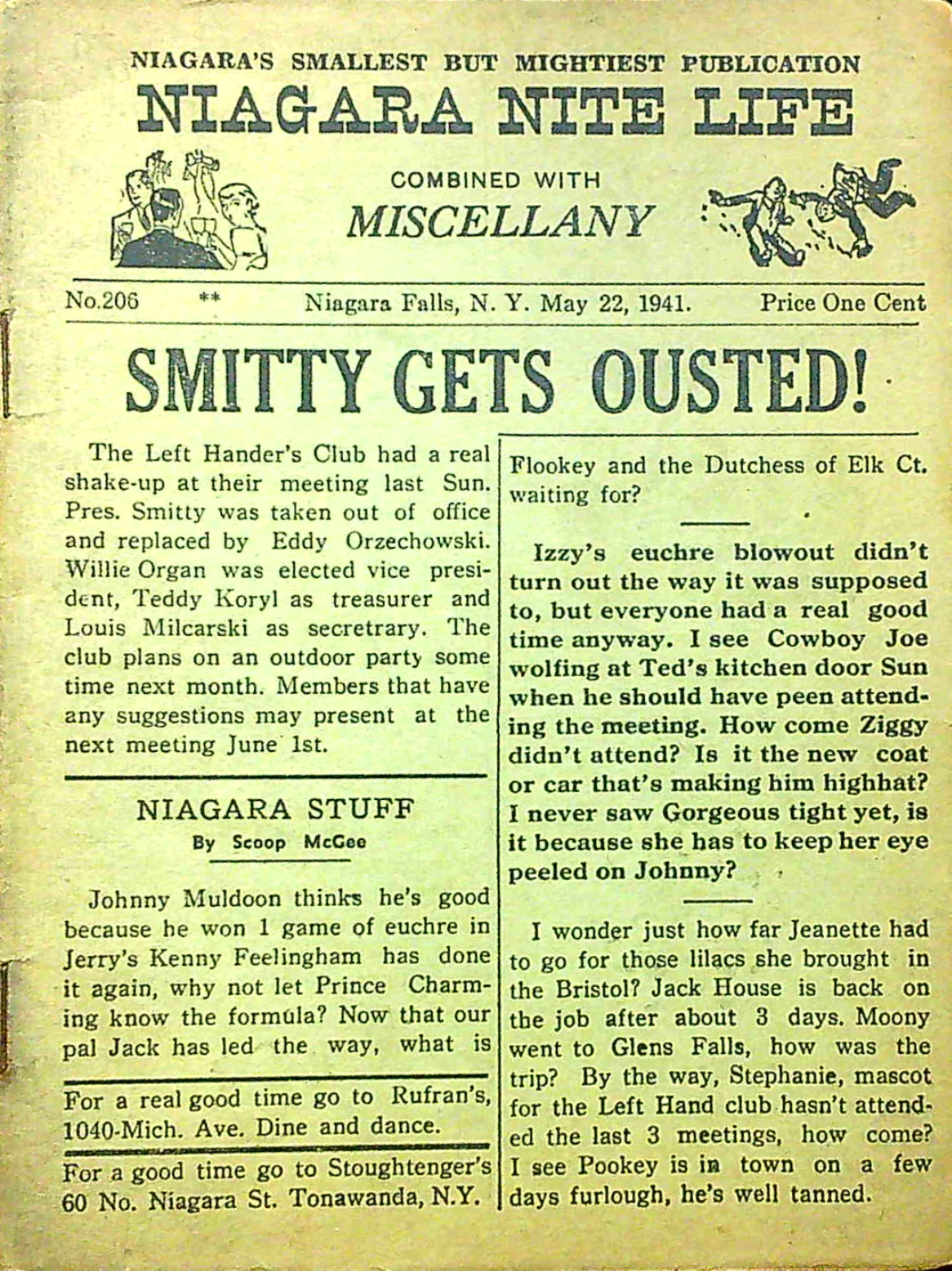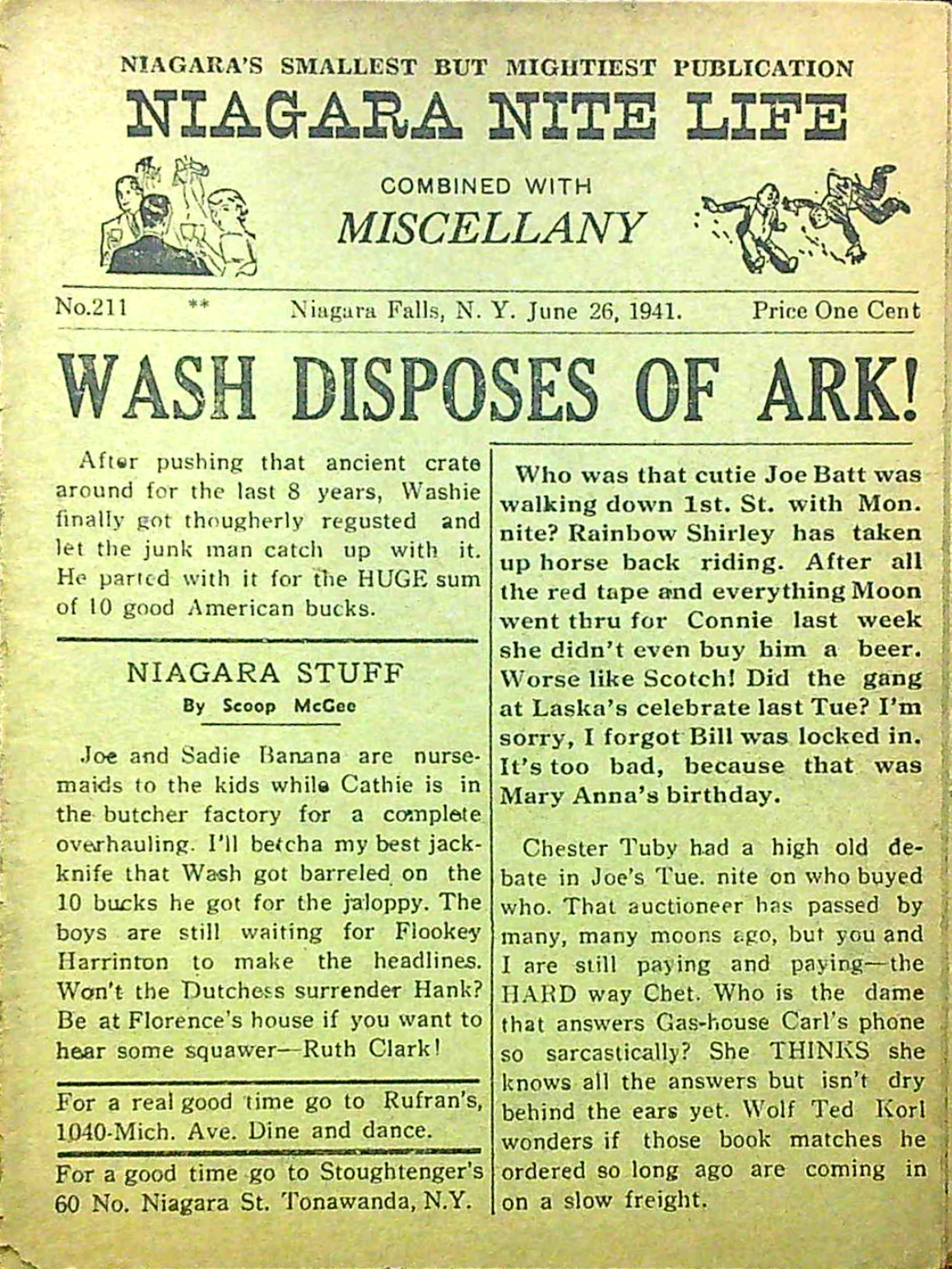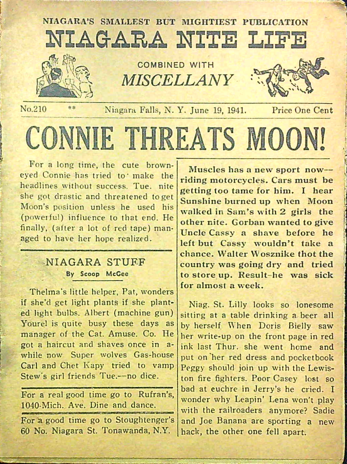 Published every thursday by “Miscellany Publishing Co., P. O. Box 751, Niagara Falls, N. Y.,” the pocket-sized Niagara Nite Life contained an assortment of local news, jokes and advertisements (mostly for restaurants and hotels.) The front page offered gossipy headlines about area residents. Shorter bits of news about locals were scattered through all 24 pages of each issue.