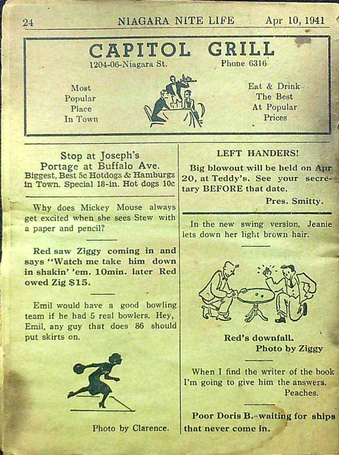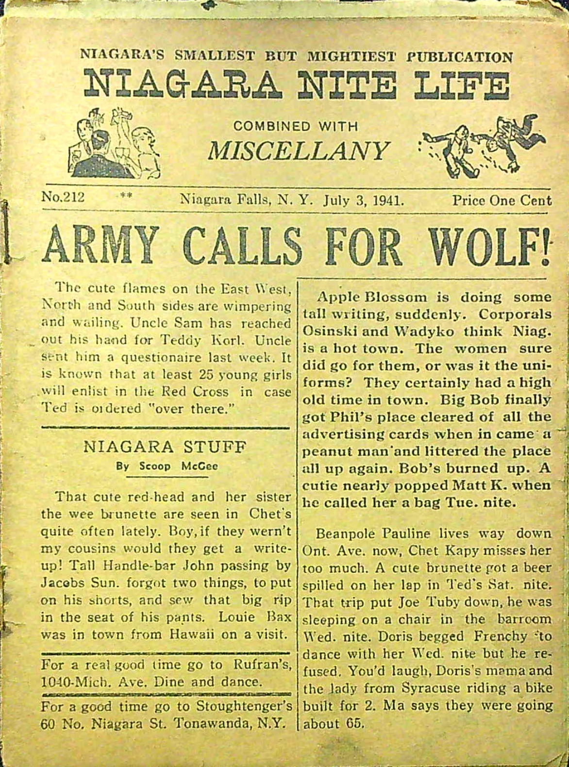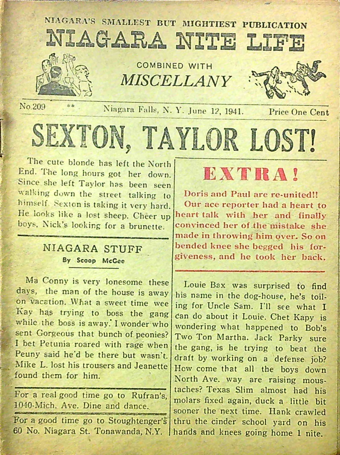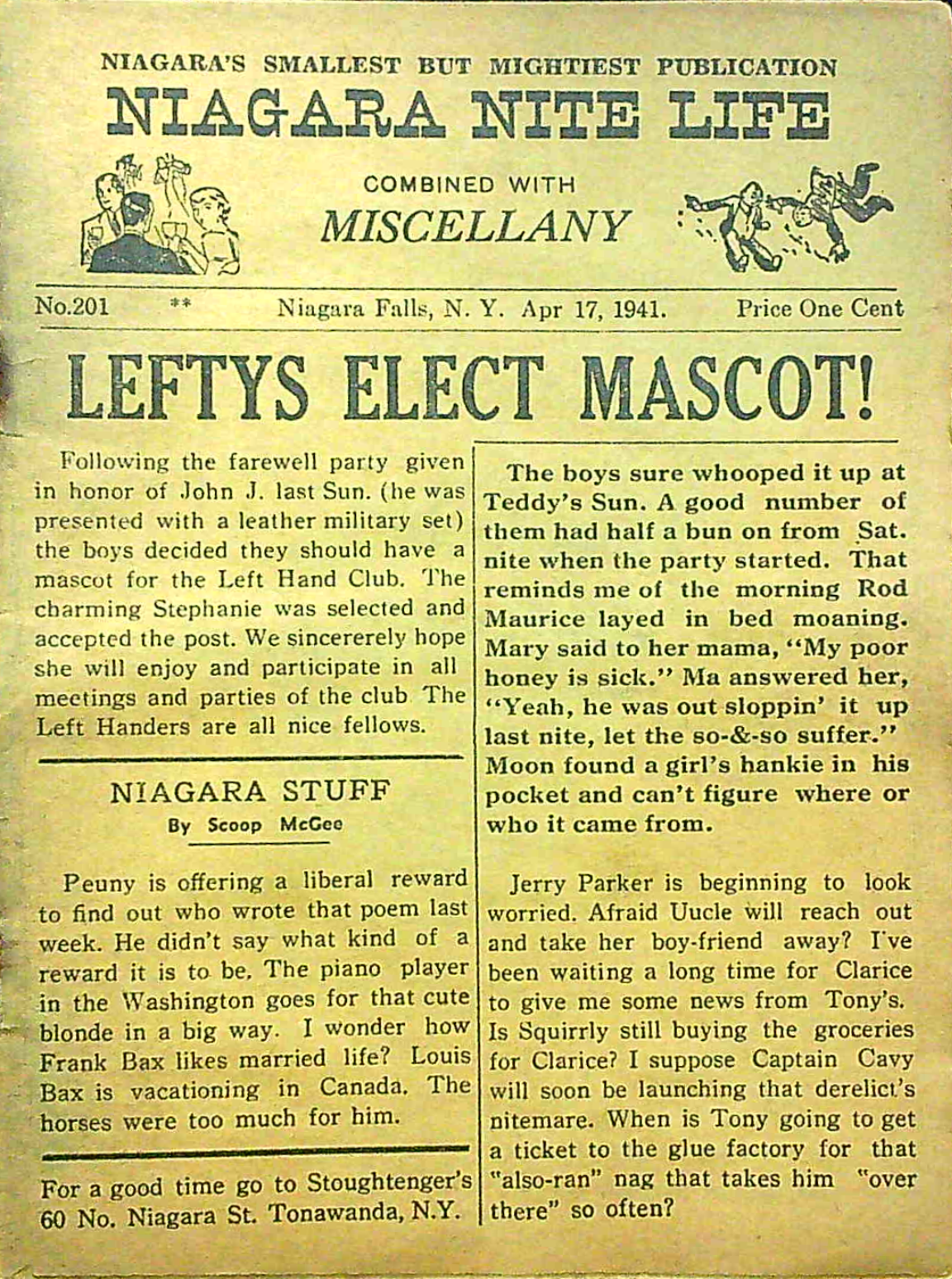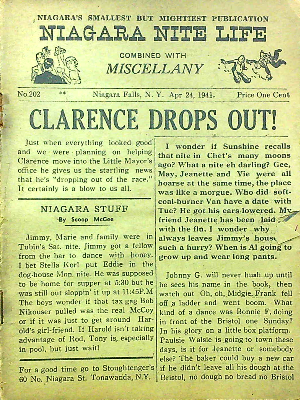 Published every thursday by “Miscellany Publishing Co., P. O. Box 751, Niagara Falls, N. Y.,” the pocket-sized Niagara Nite Life contained an assortment of local news, jokes and advertisements (mostly for restaurants and hotels.) The front page offered gossipy headlines about area residents. Shorter bits of news about locals were scattered through all 24 pages of each issue.