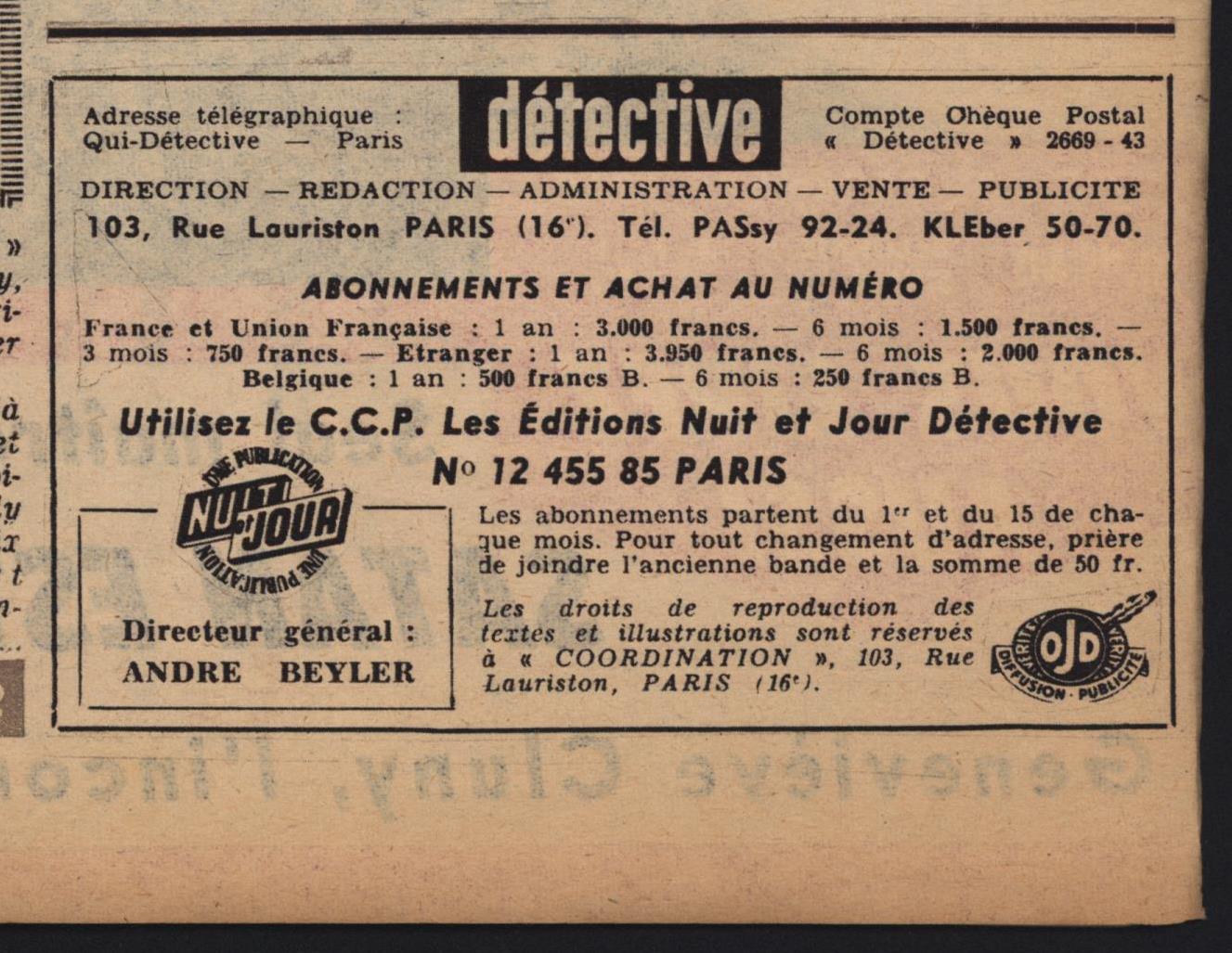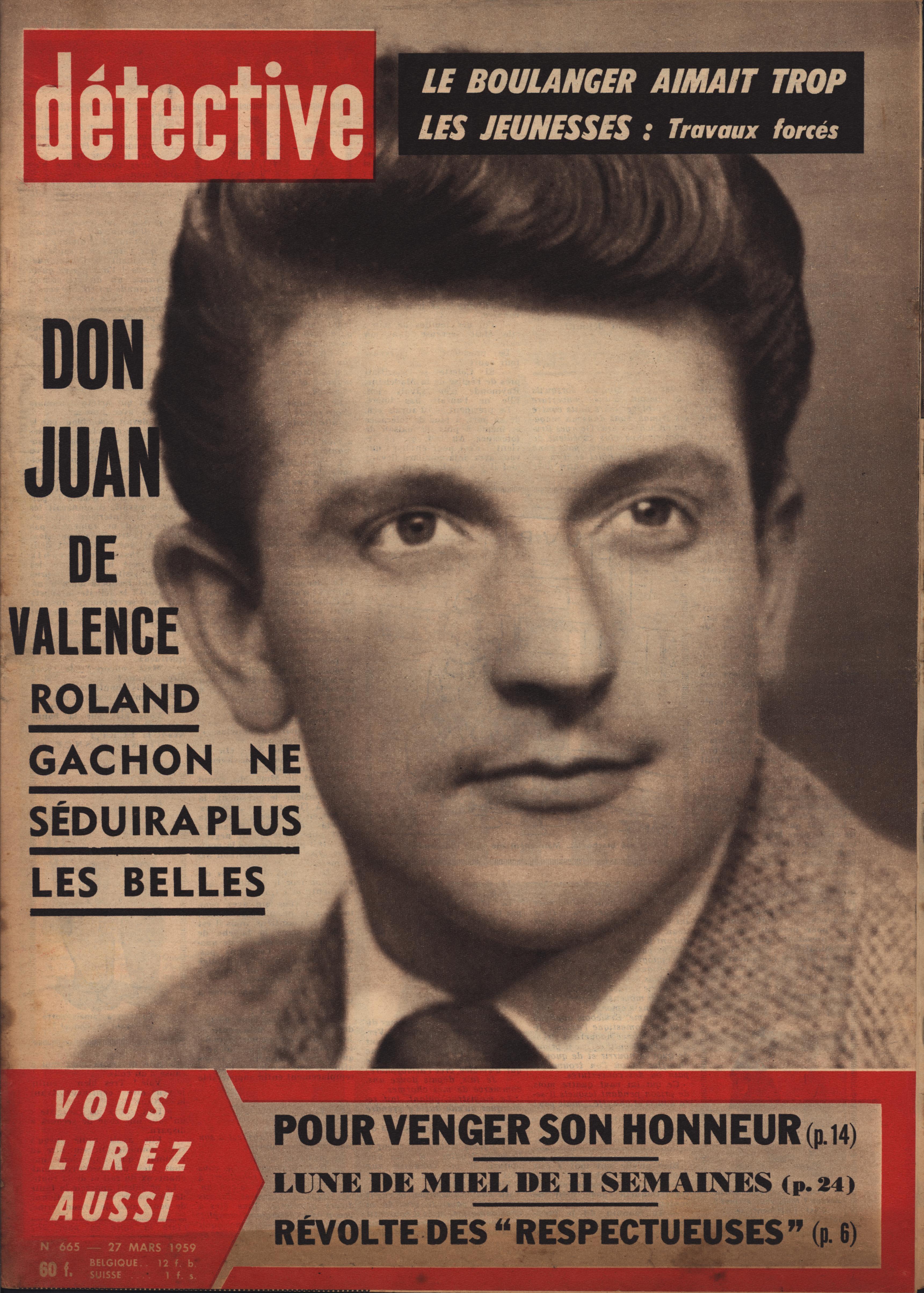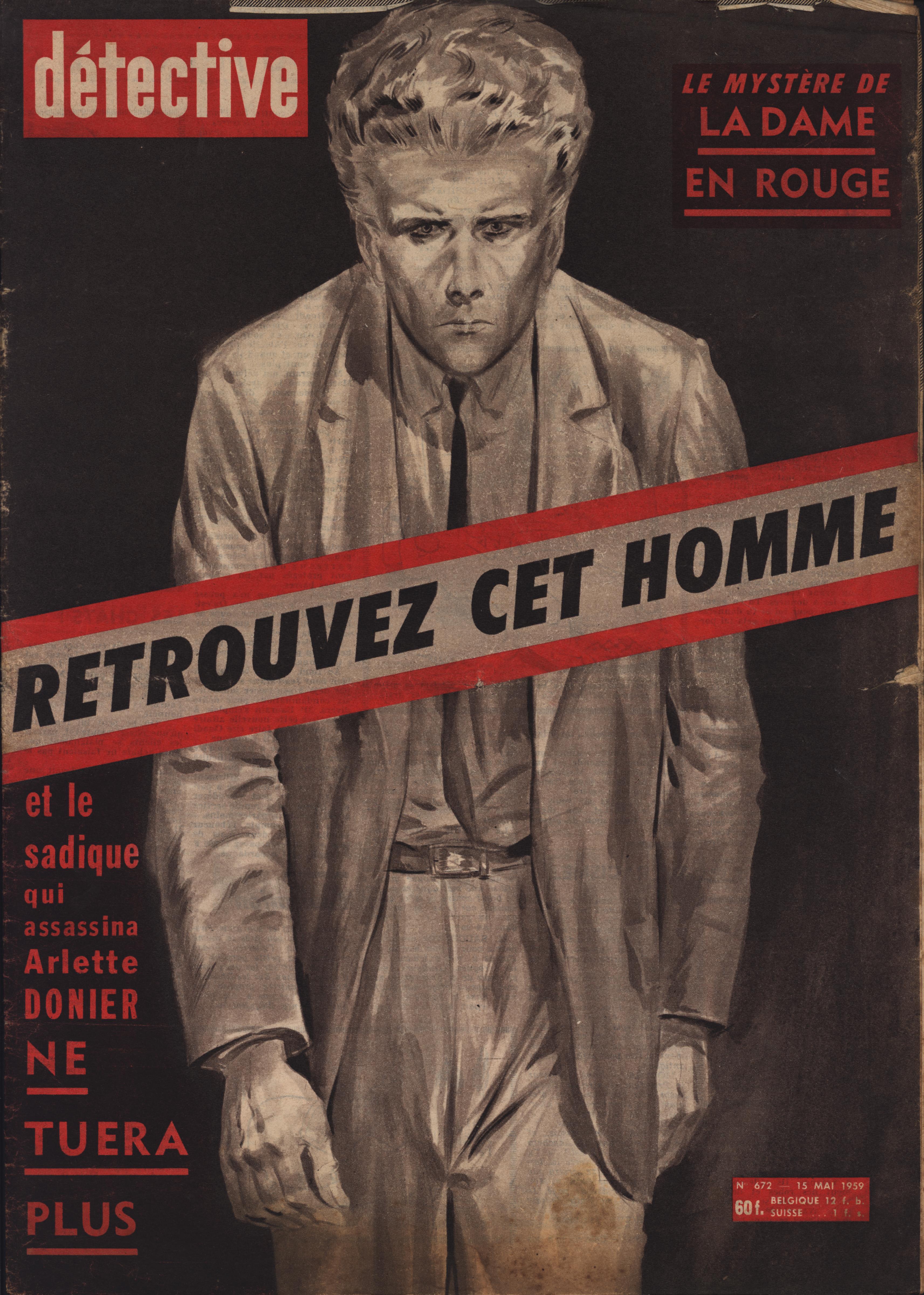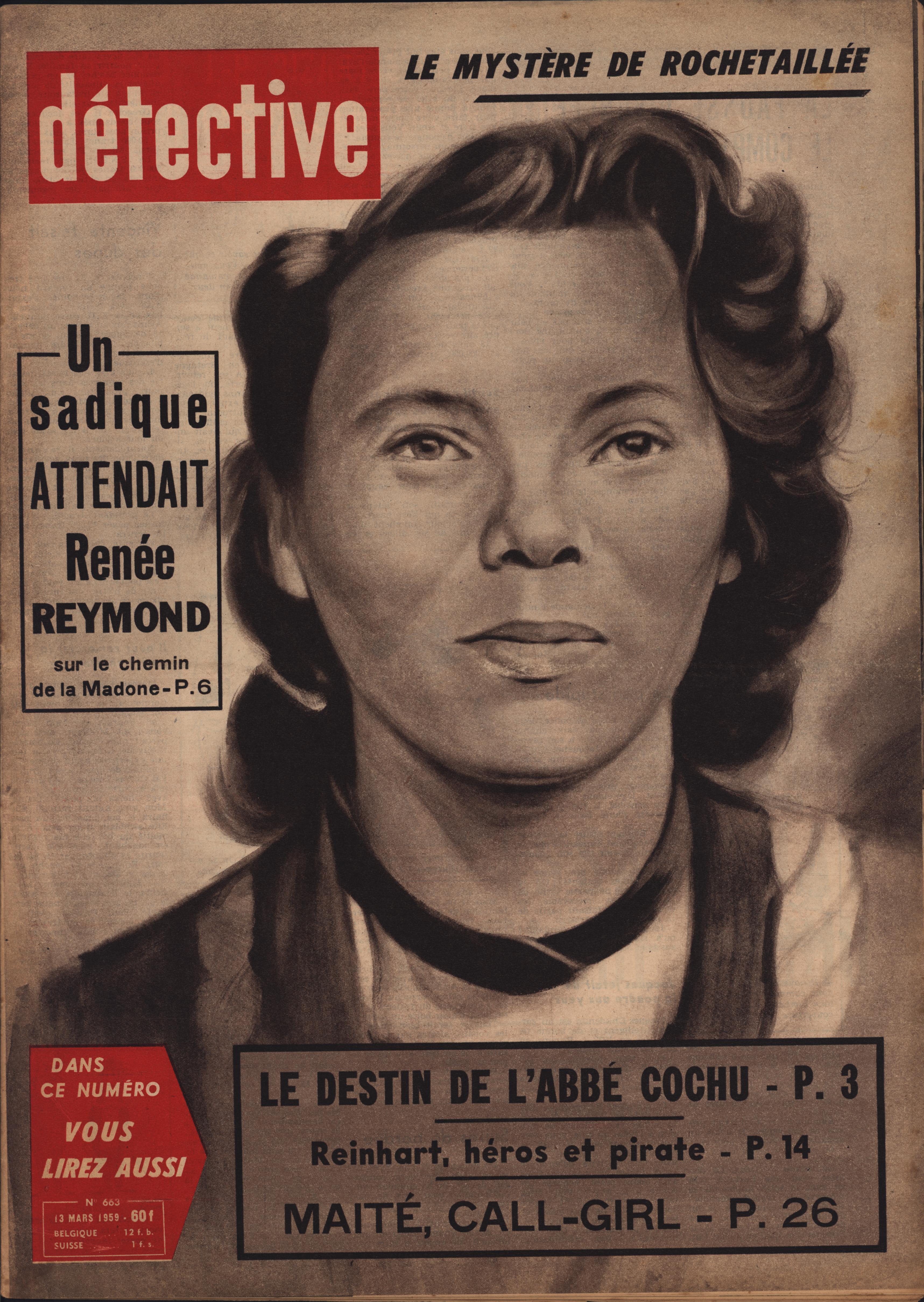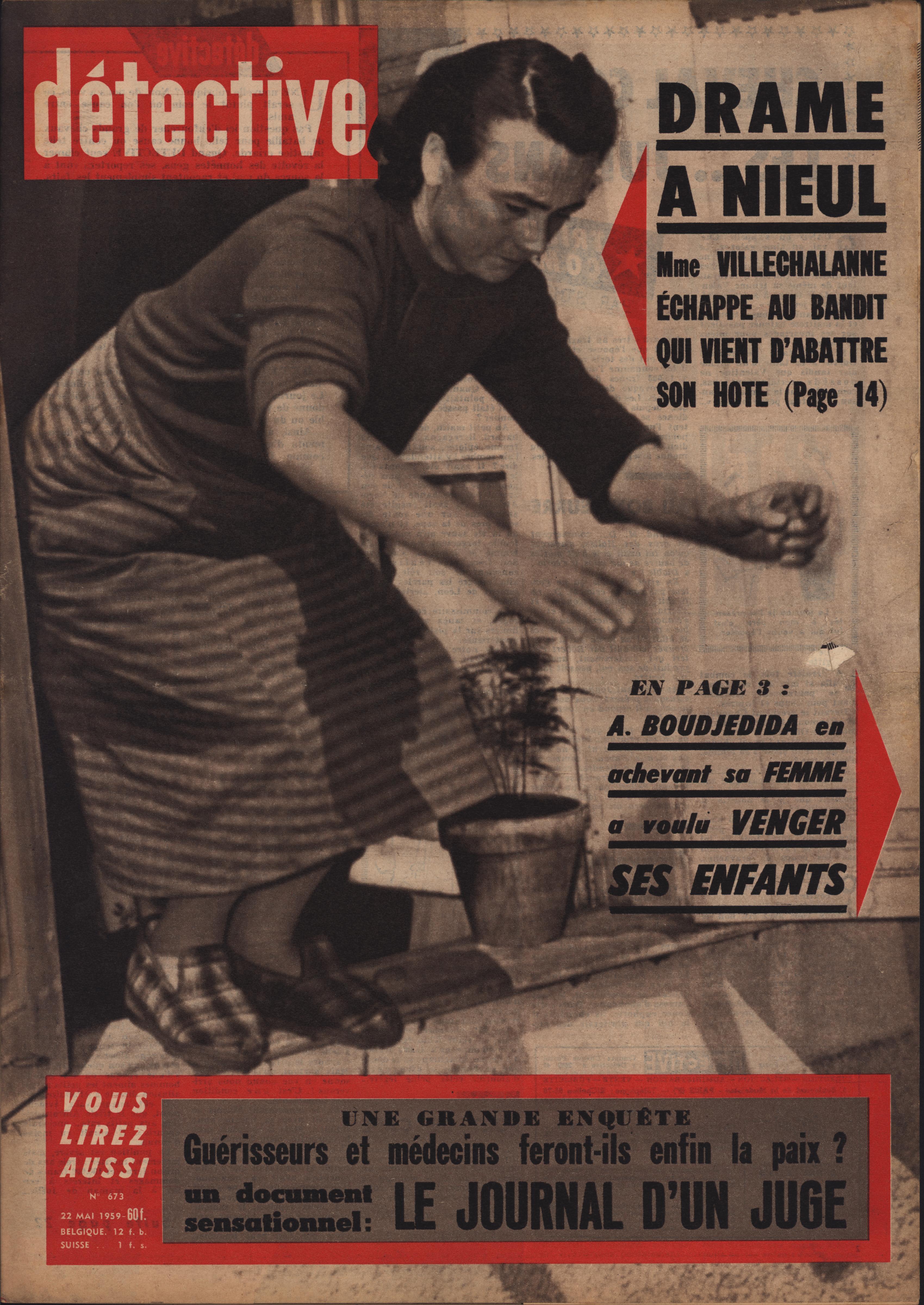 In 1958, Qui? Detective returned to its original title, Détective. By the end of that year, a fresh new design brought banners with red backgrounds to its cover and other evidence of a more modern look. In these issues from 1959, several headlines make reference to stories inside — this represented a change from most earlier issues of the magazine, which rarely had more than one title on their covers. With this redesign, Détective edged towards the emphasis on entertainment celebrities and sex crimes for which it would be notorious in later decades.