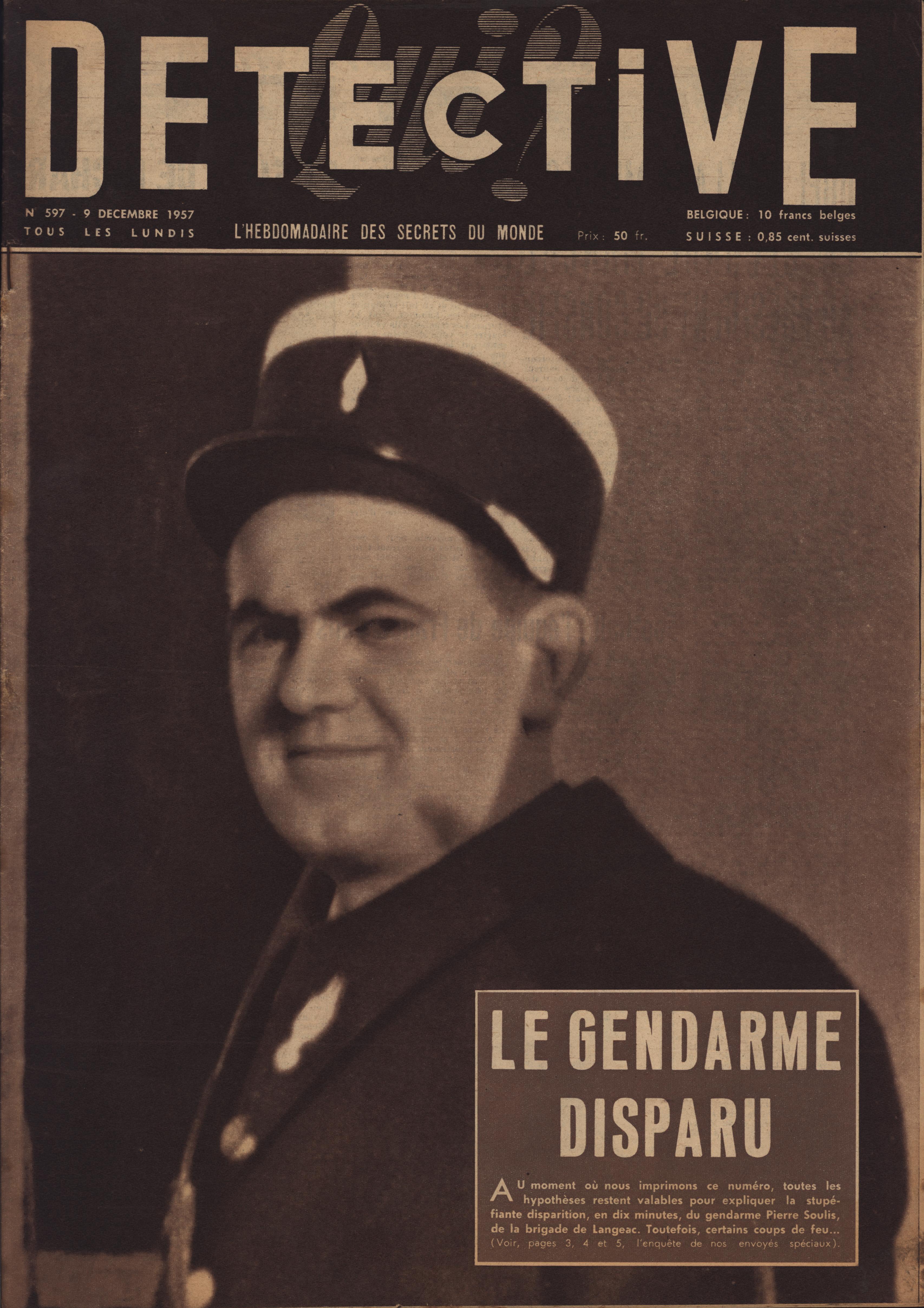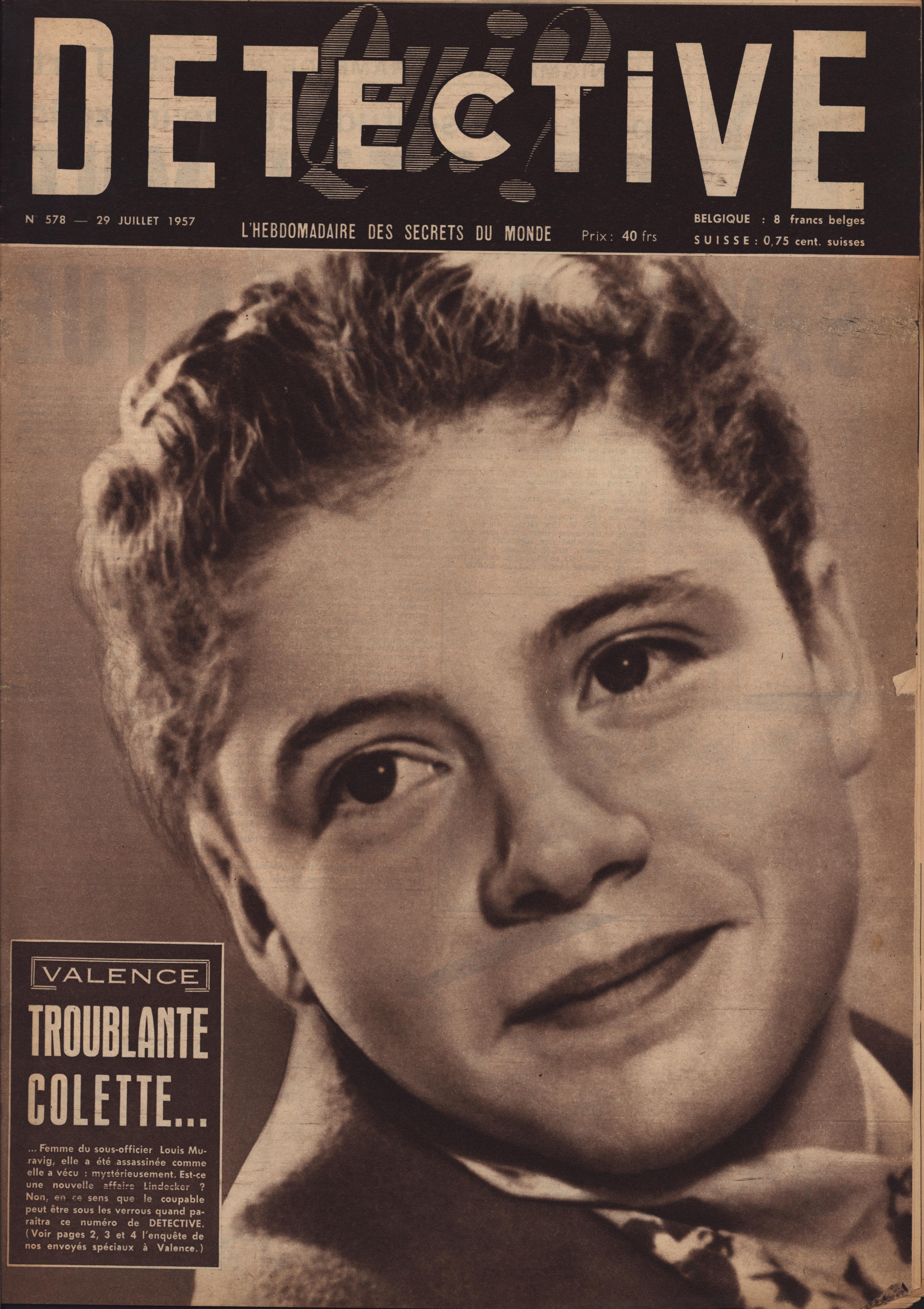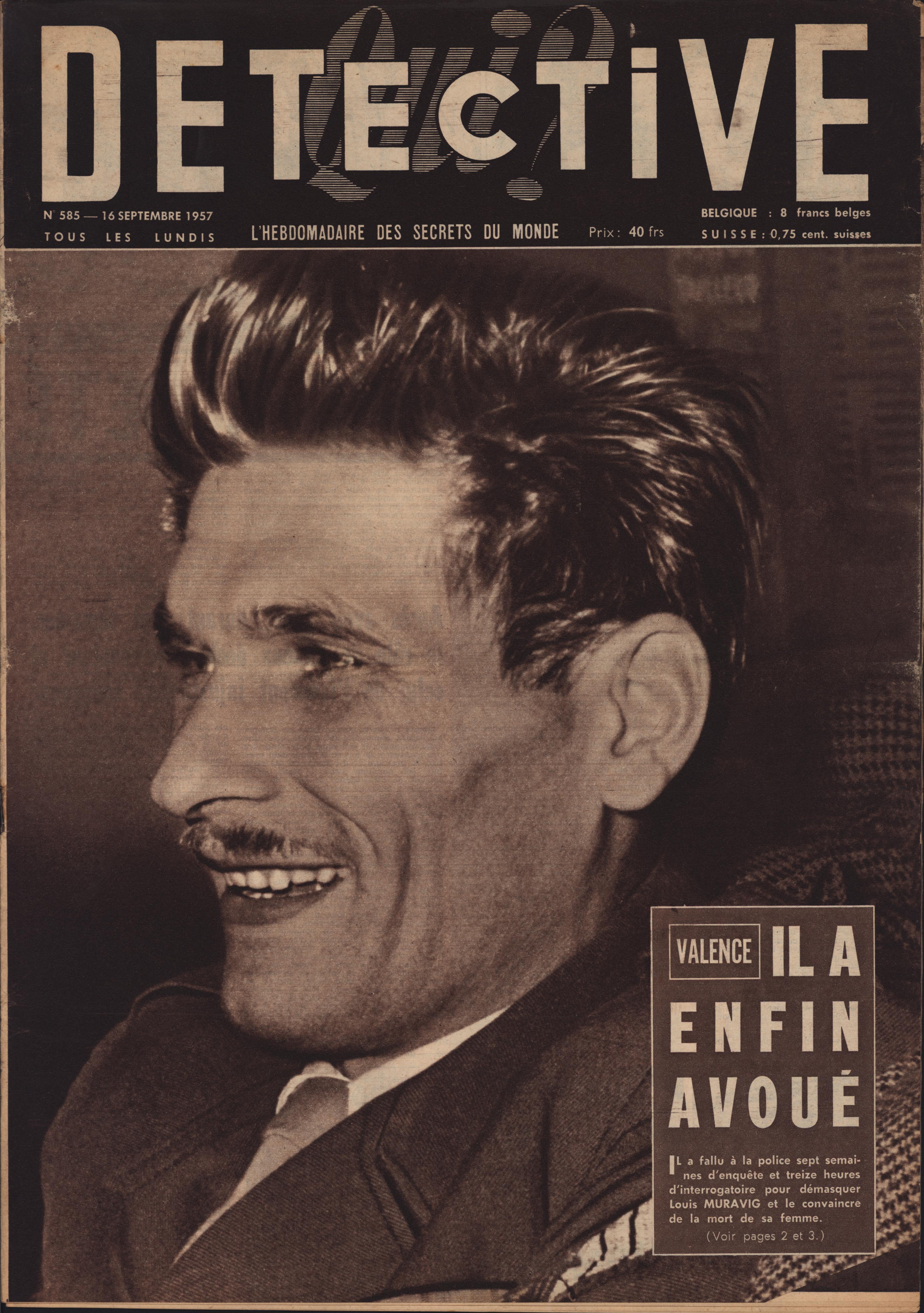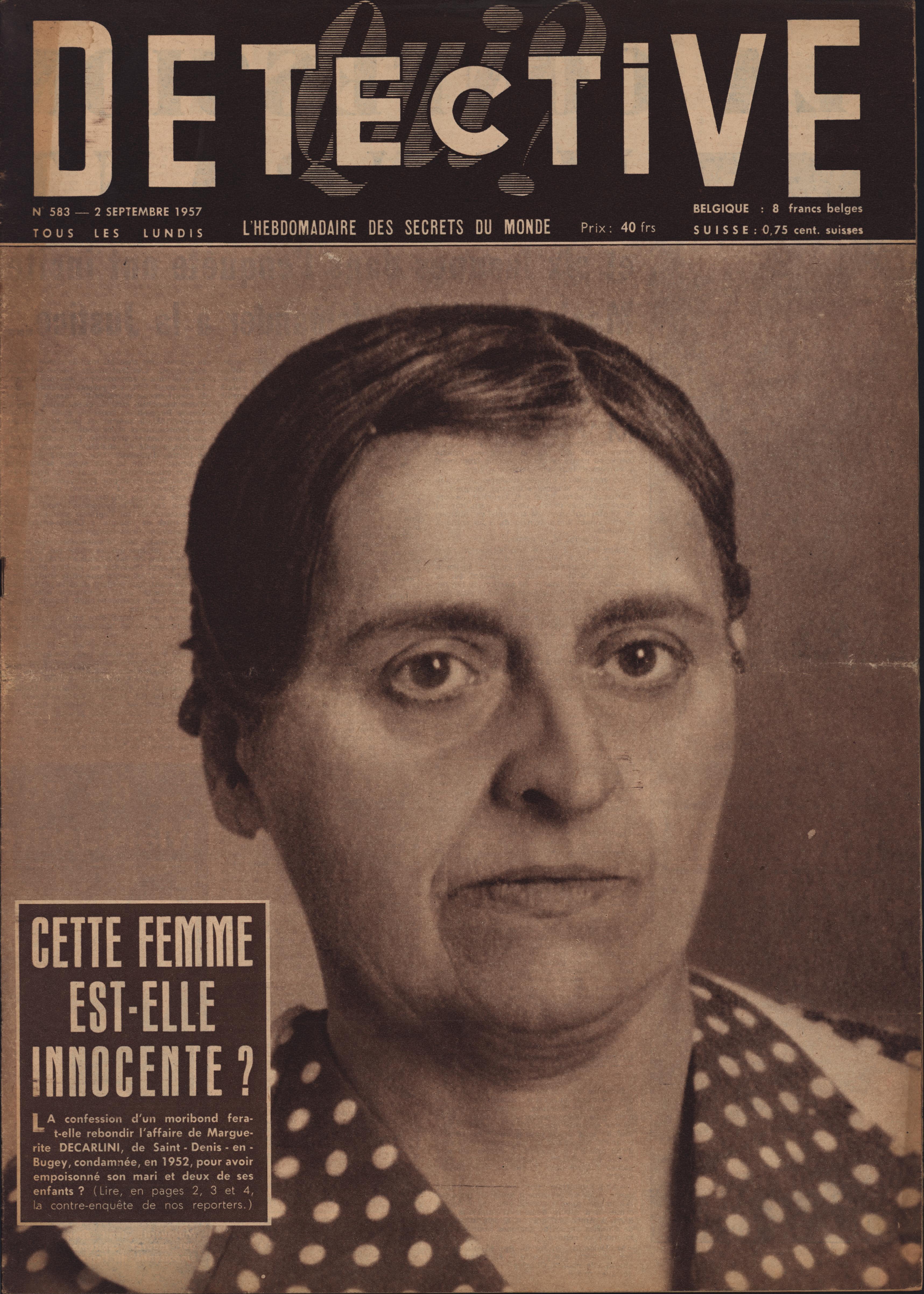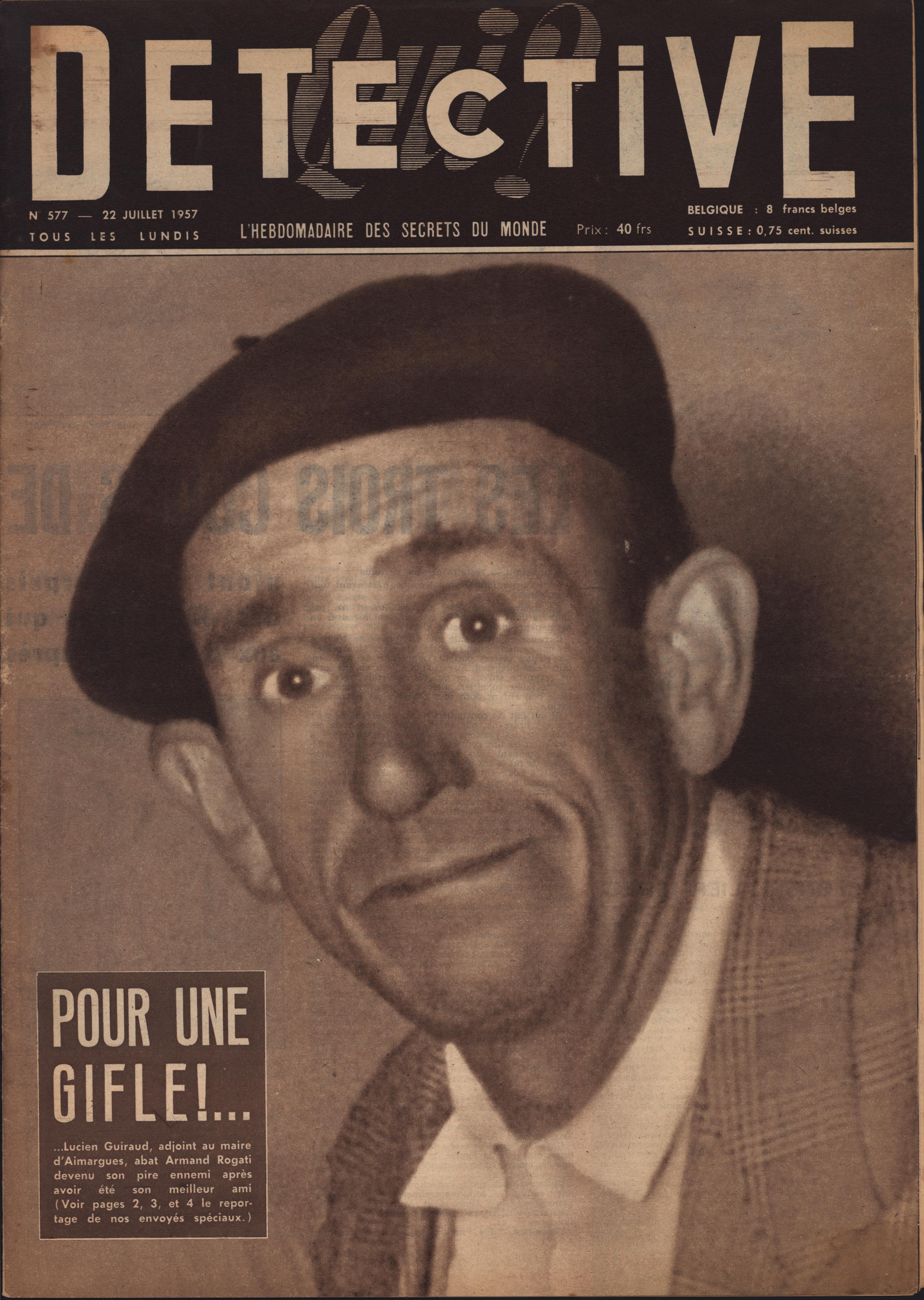 In 1946, rights to the title Détective were sold to the French Beyler group, who published it as Qui? Détective until 1958. In this and other galleries, we will present covers of the various incarnations of Détective as it changed title and style several times from the end of World War II until the present day. This gallery features issues of Qui? Détective from 1957. One of the striking features of this year’s covers is their almost exclusive domination by portraits — by people asking us to judge them, by others condemned, by the victimized. Because the back covers of Qui? Détective featured panel cartoons rather than photographs, we have not included them.