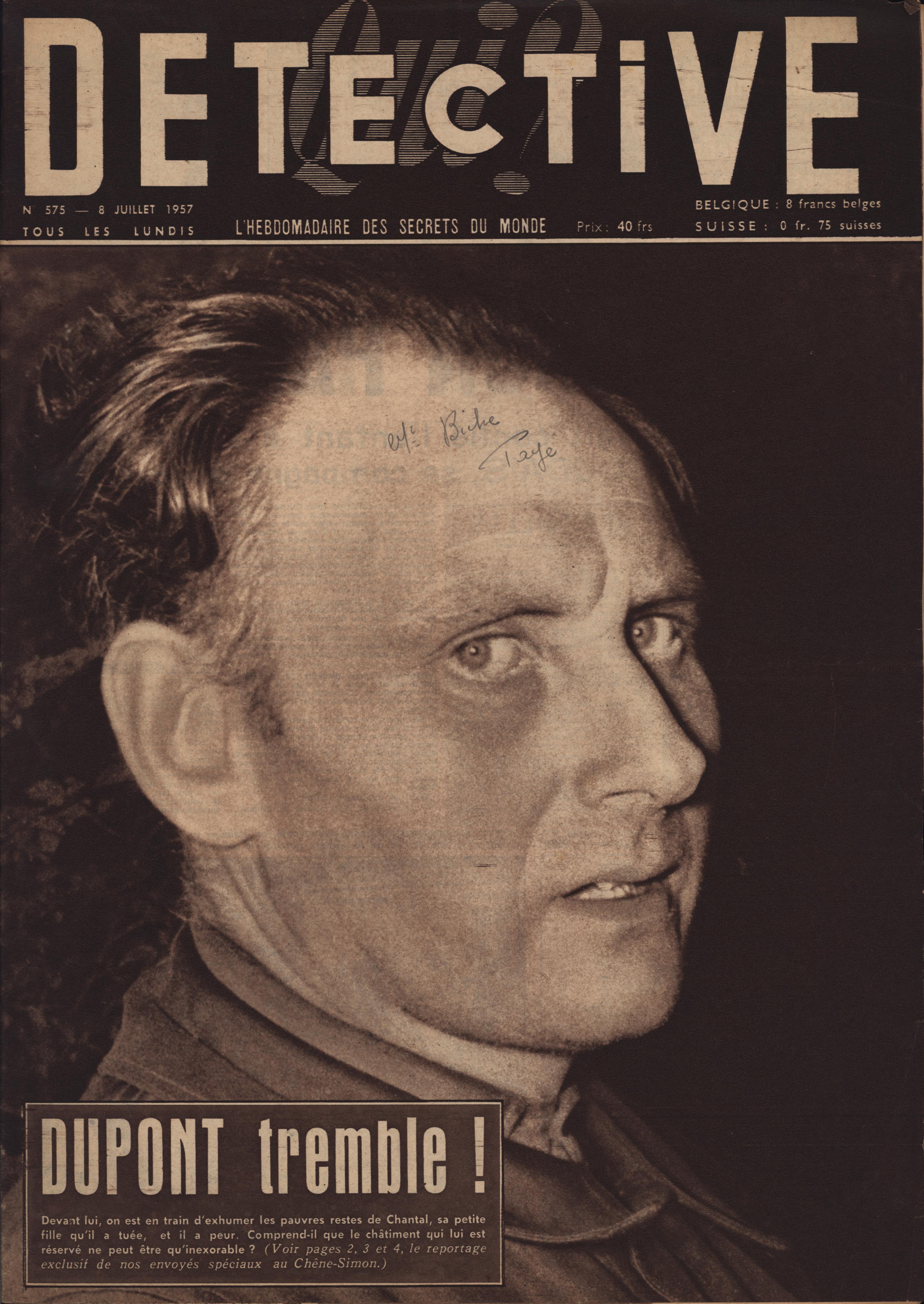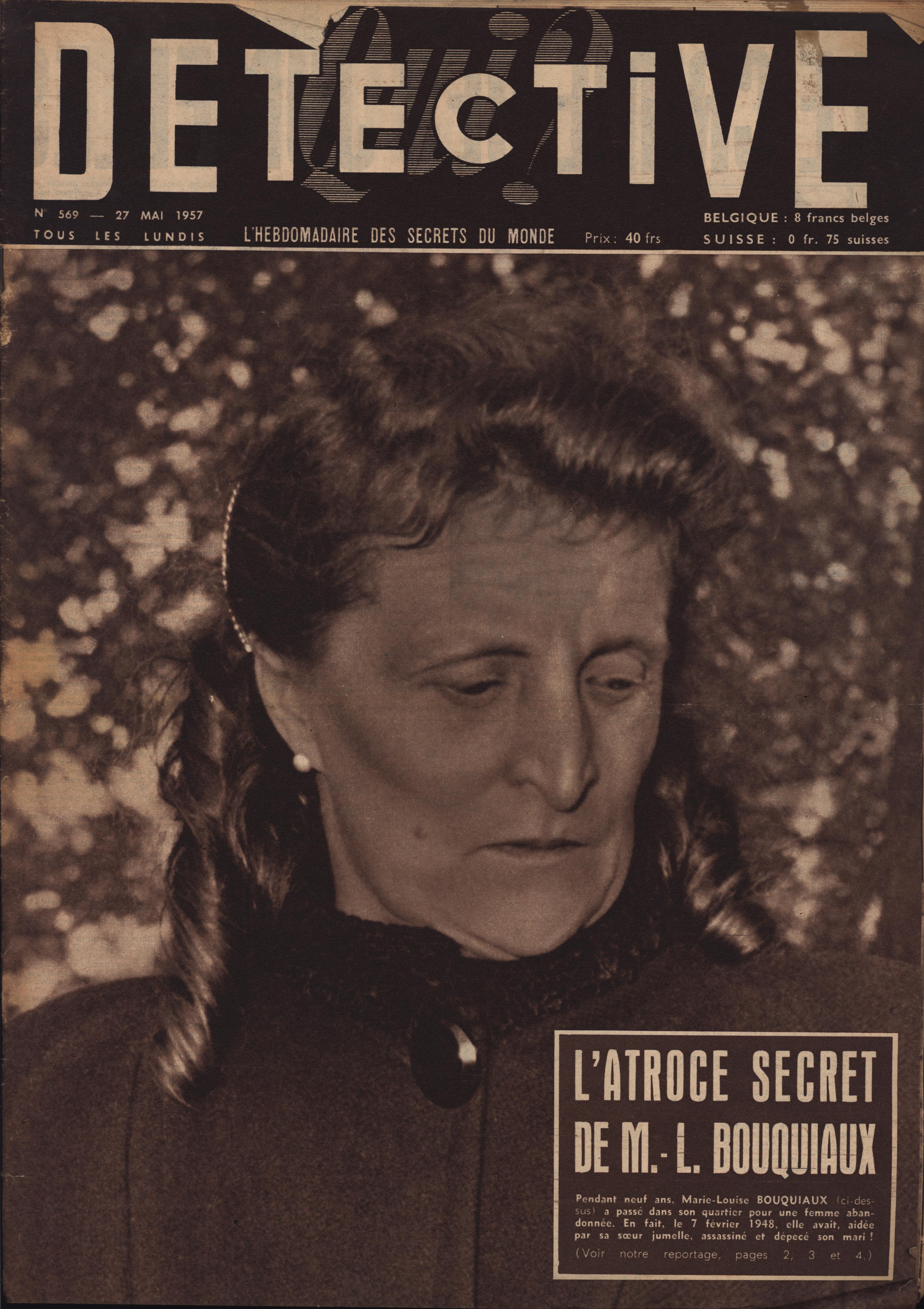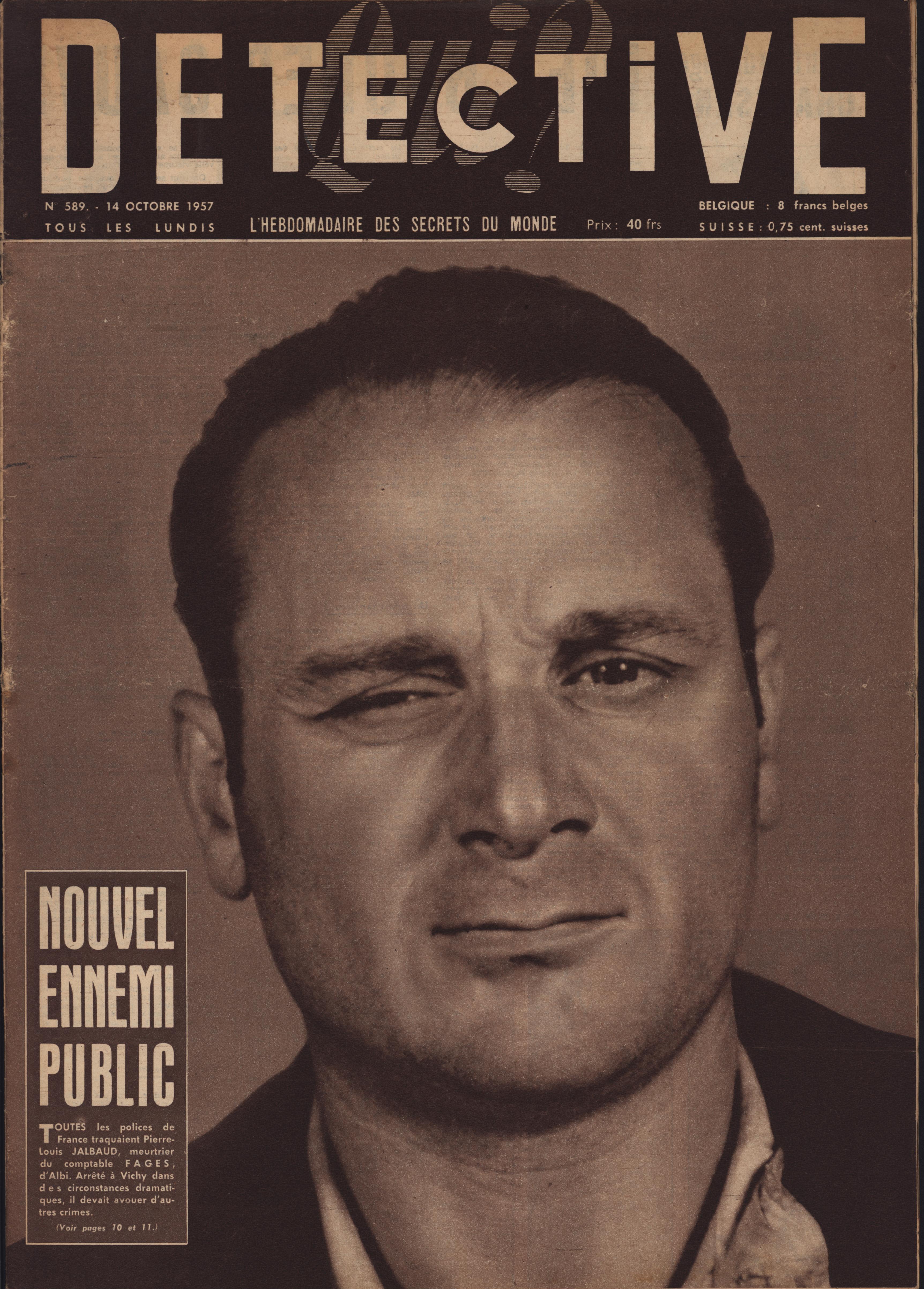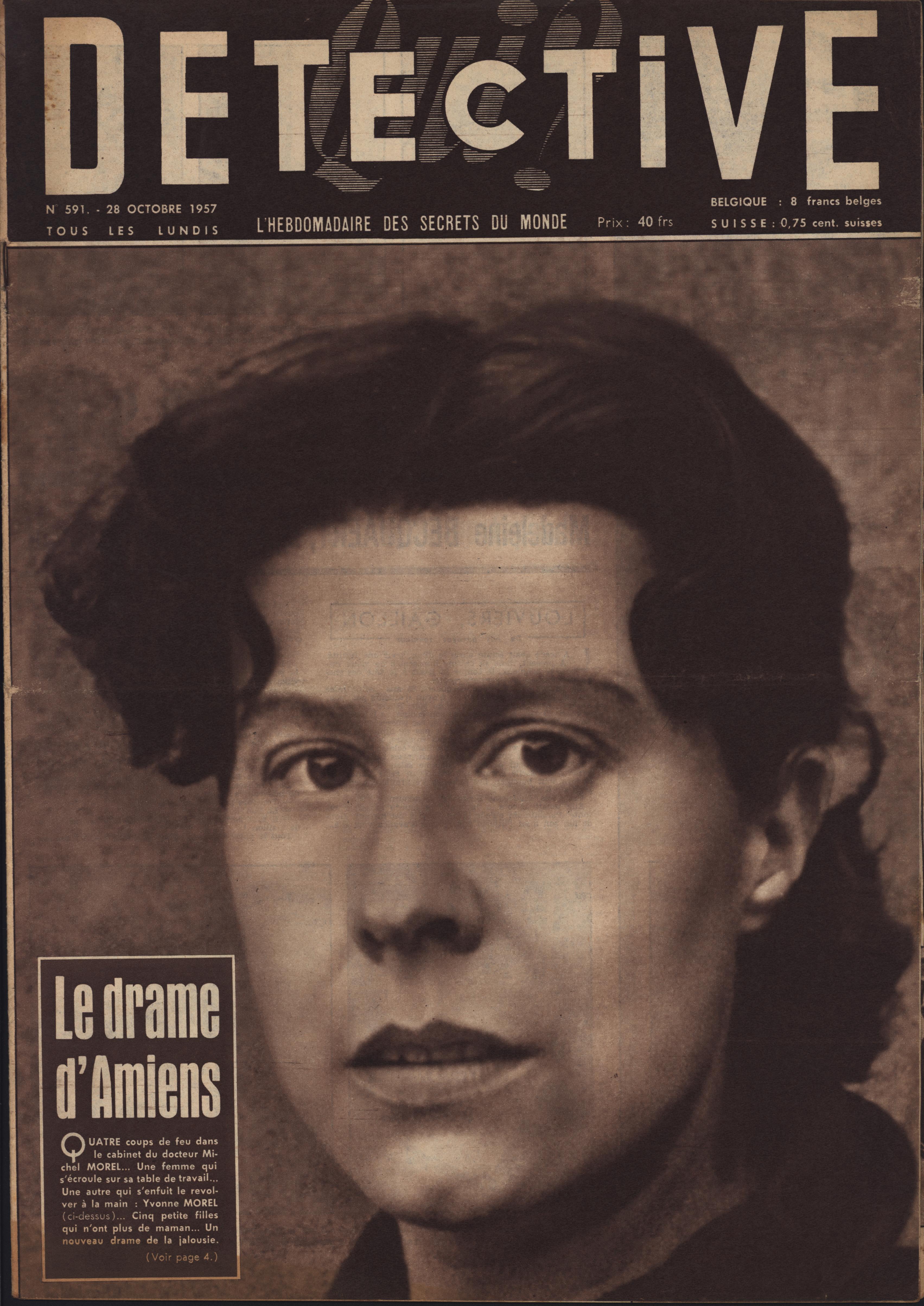 In 1946, rights to the title Détective were sold to the French Beyler group, who published it as Qui? Détective until 1958. In this and other galleries, we will present covers of the various incarnations of Détective as it changed title and style several times from the end of World War II until the present day. This gallery features issues of Qui? Détective from 1957. One of the striking features of this year’s covers is their almost exclusive domination by portraits — by people asking us to judge them, by others condemned, by the victimized. Because the back covers of Qui? Détective featured panel cartoons rather than photographs, we have not included them.