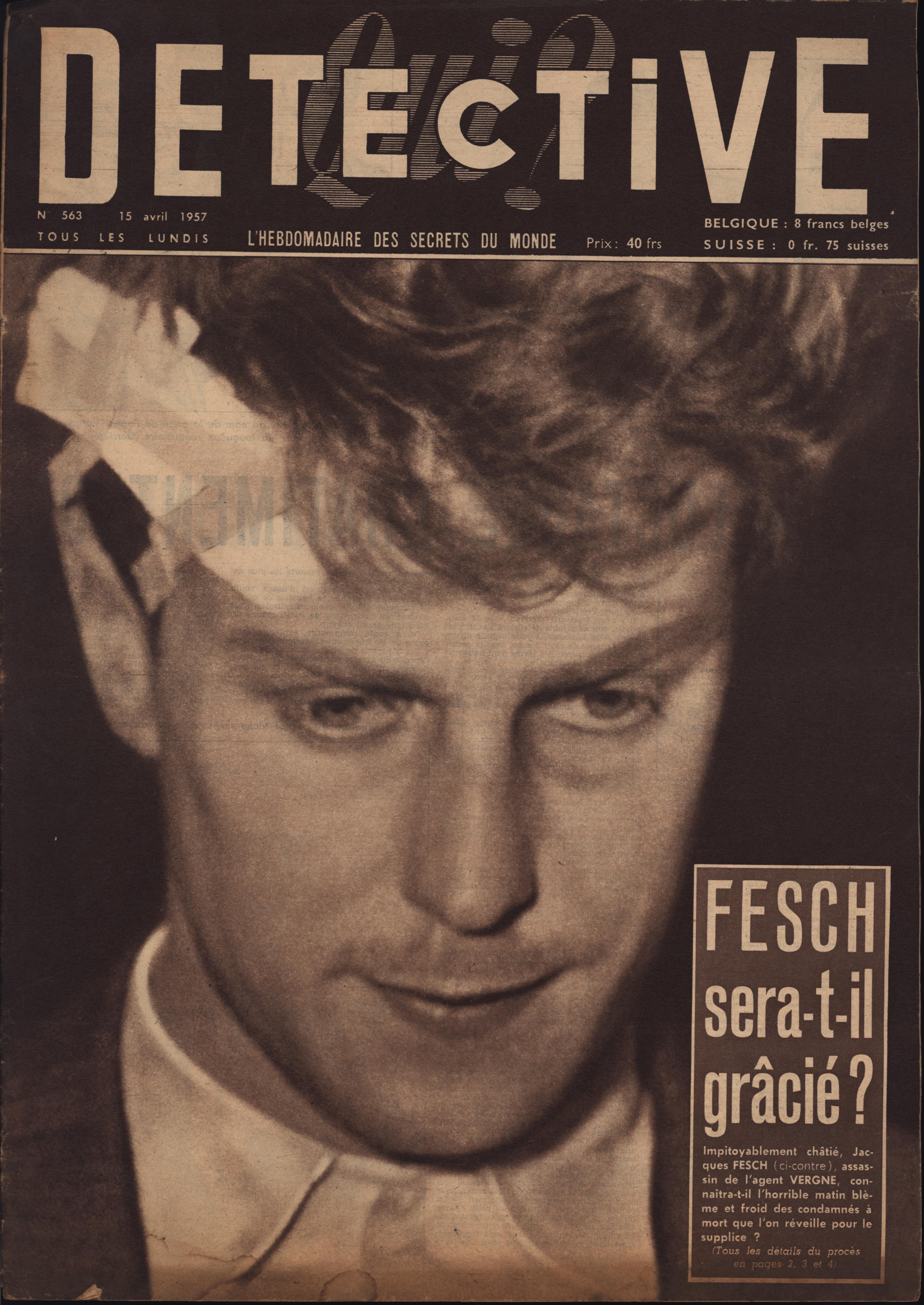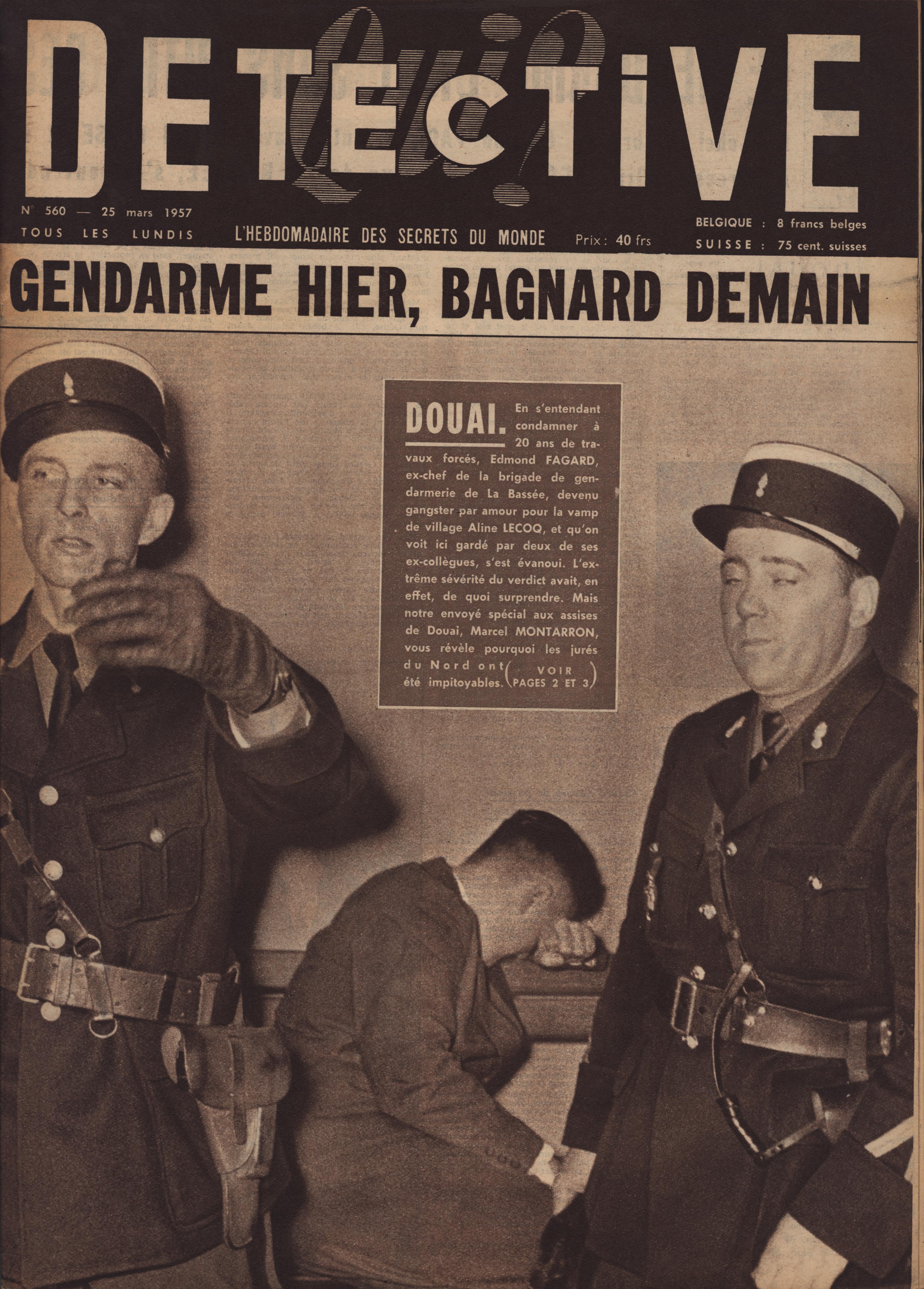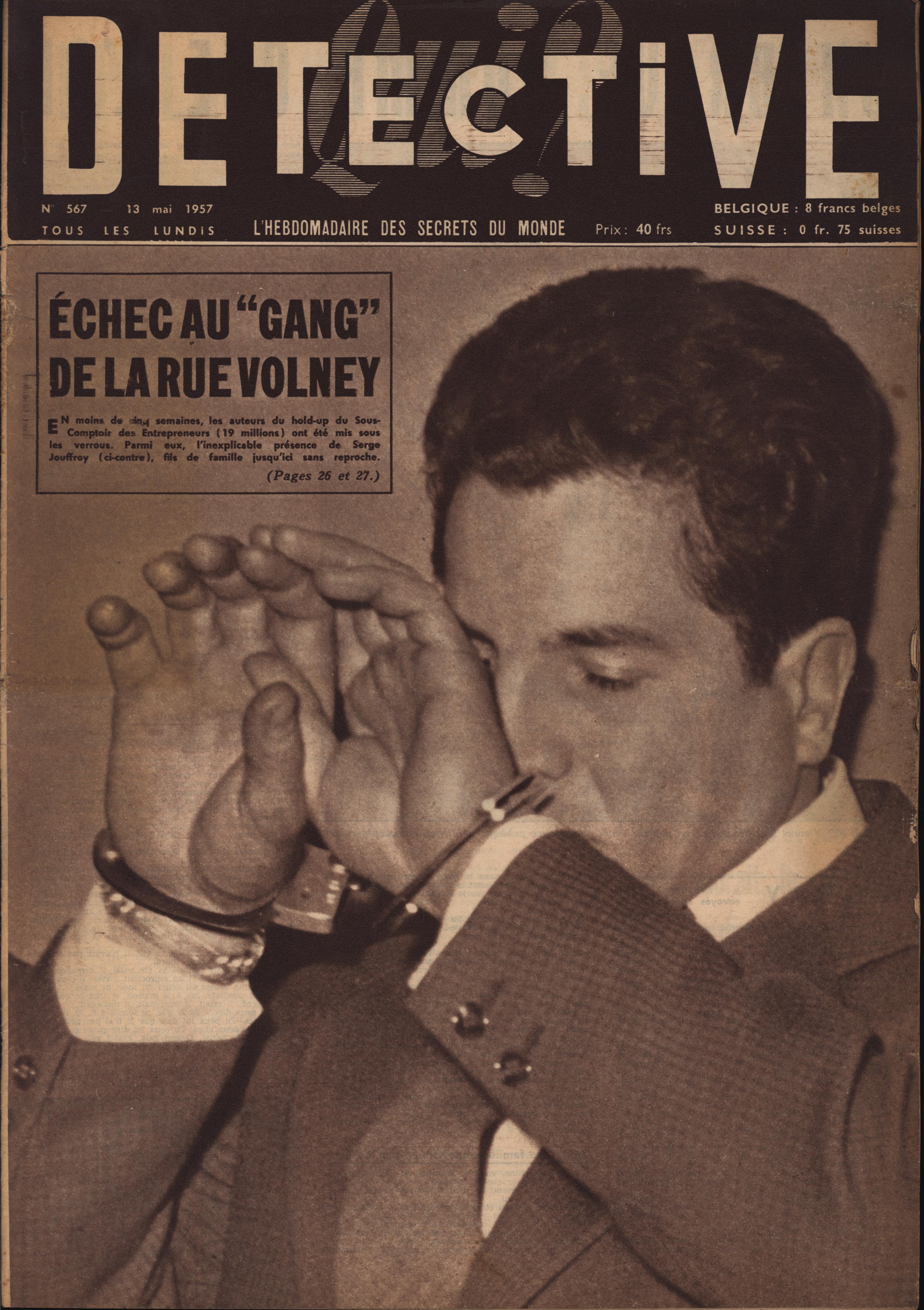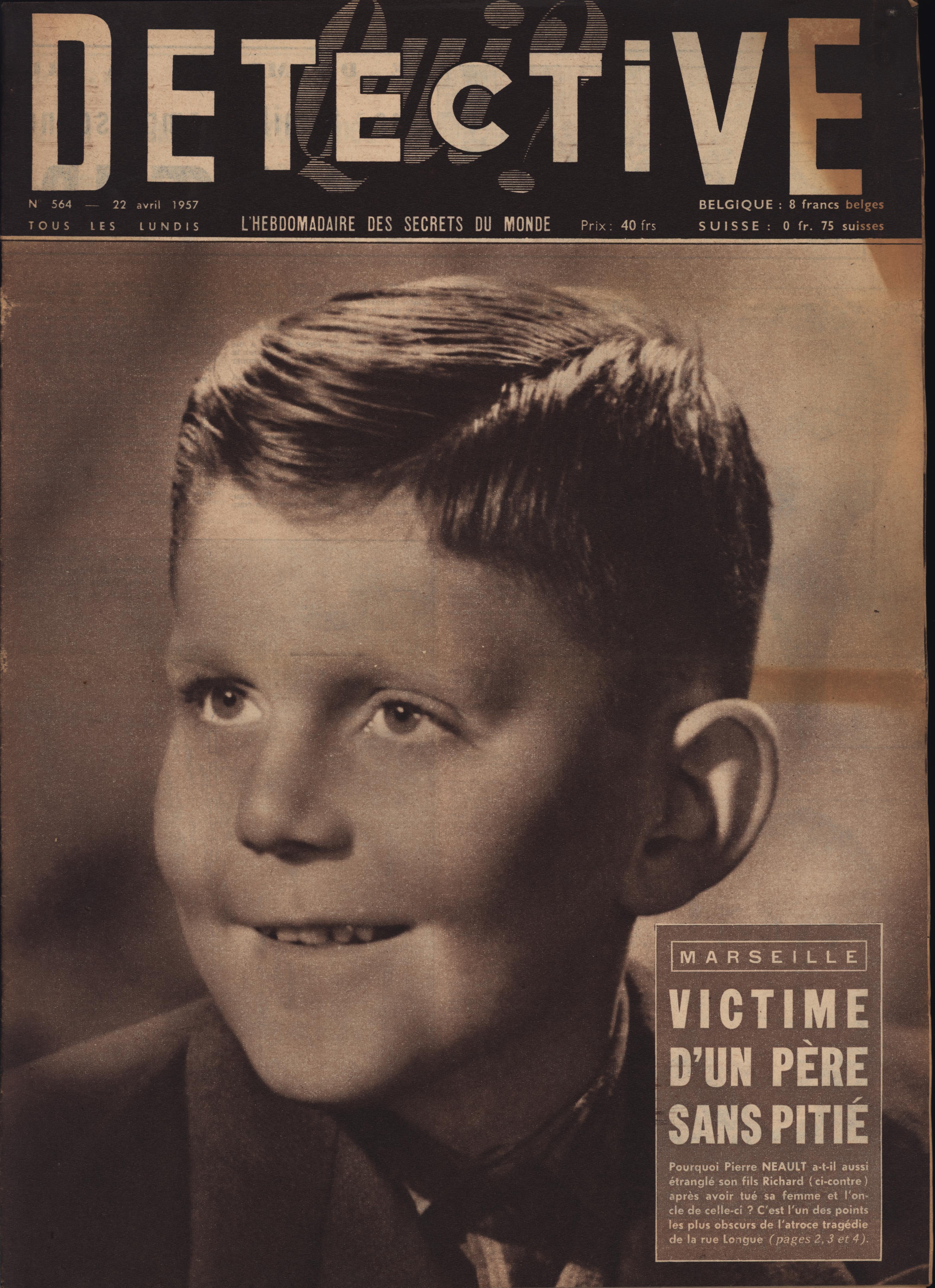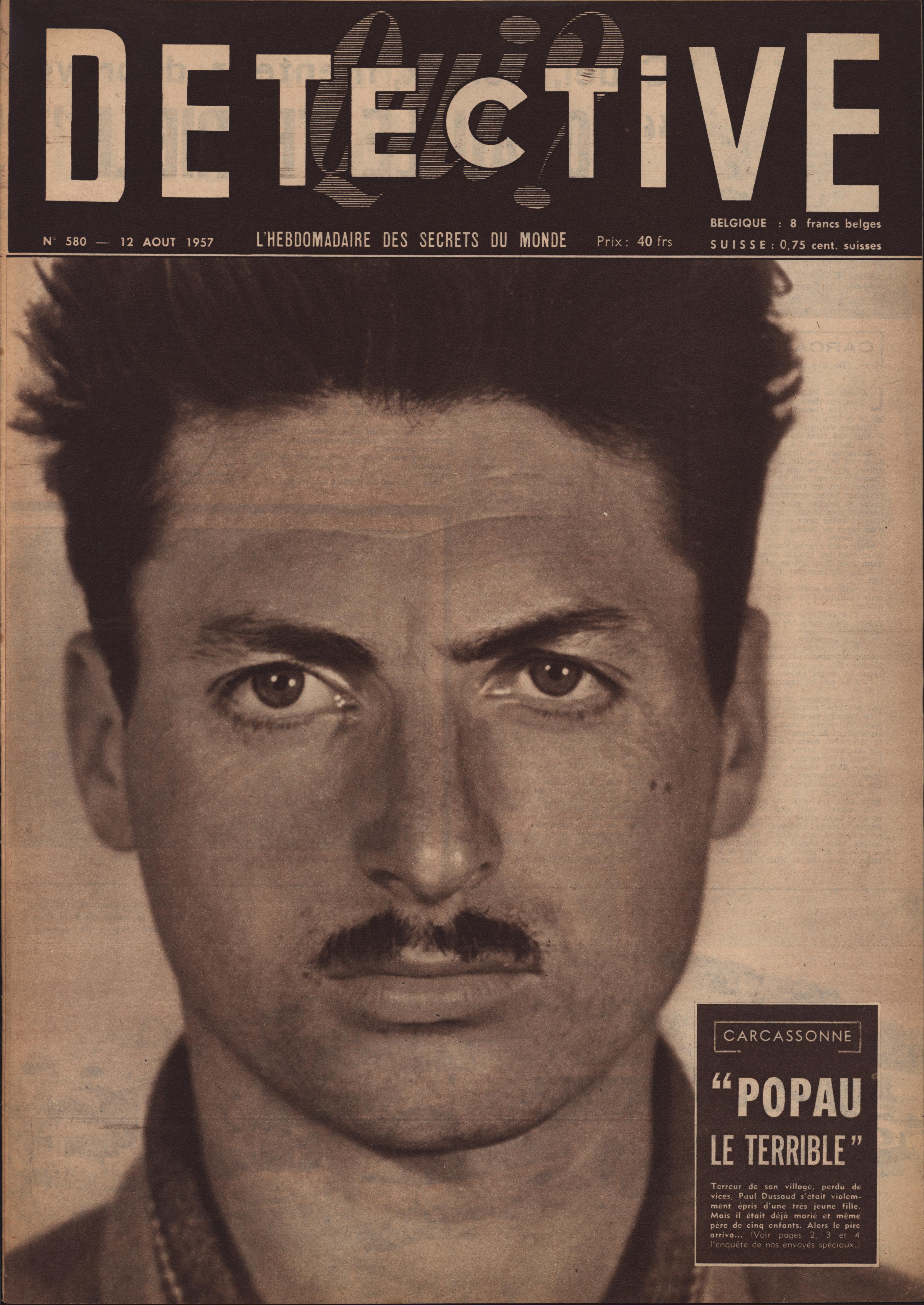 In 1946, rights to the title Détective were sold to the French Beyler group, who published it as Qui? Détective until 1958. In this and other galleries, we will present covers of the various incarnations of Détective as it changed title and style several times from the end of World War II until the present day. This gallery features issues of Qui? Détective from 1957. One of the striking features of this year’s covers is their almost exclusive domination by portraits — by people asking us to judge them, by others condemned, by the victimized. Because the back covers of Qui? Détective featured panel cartoons rather than photographs, we have not included them.