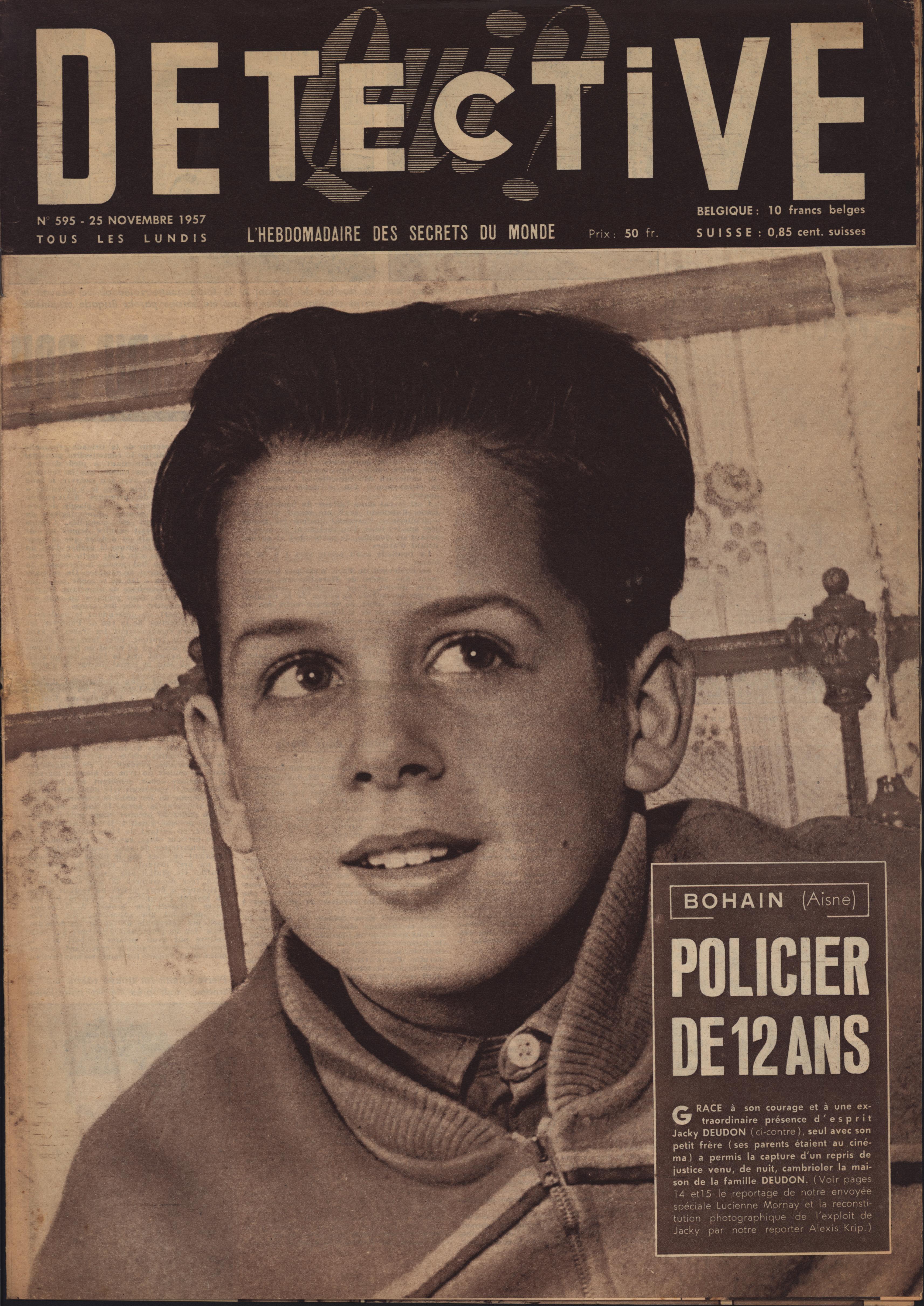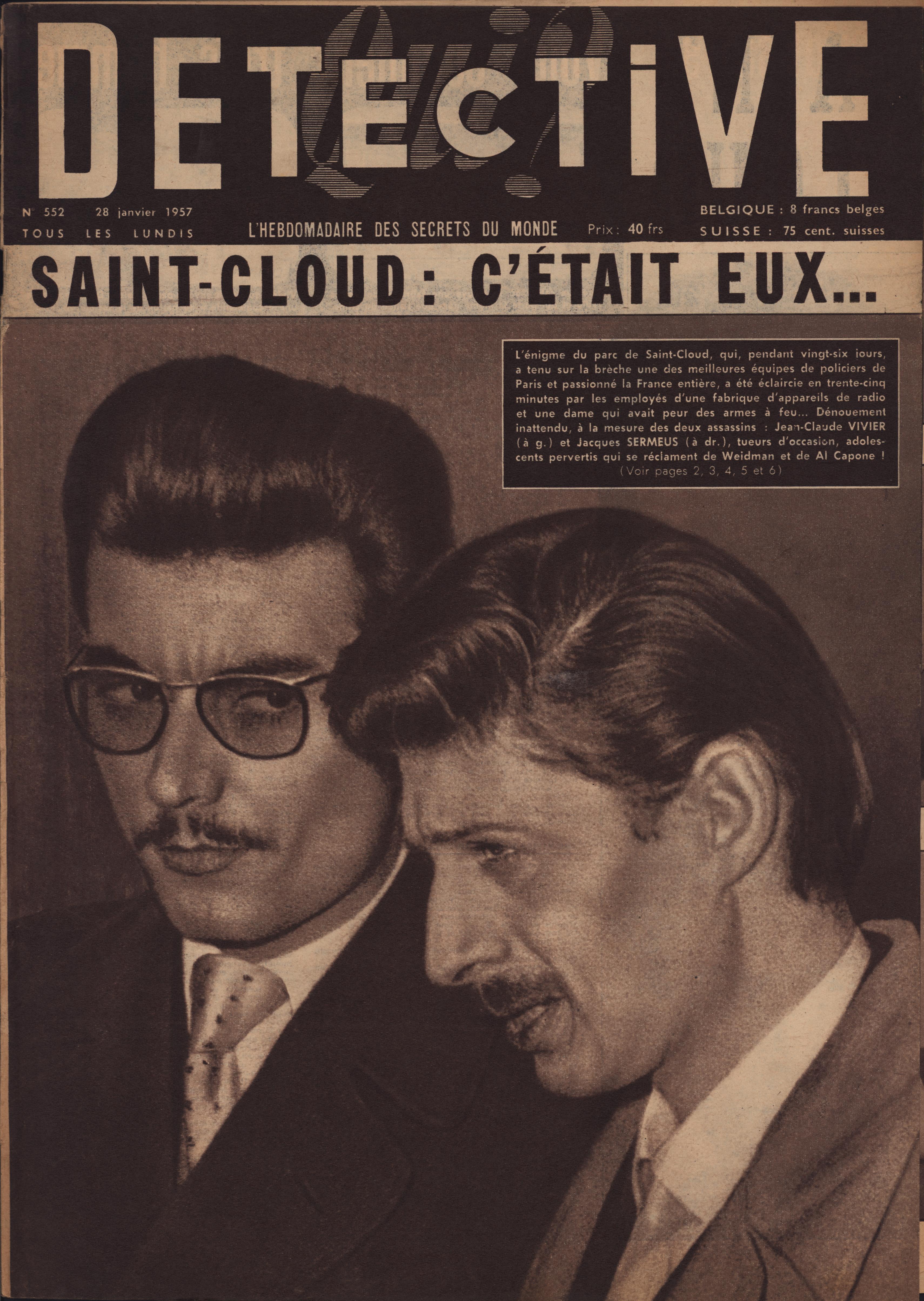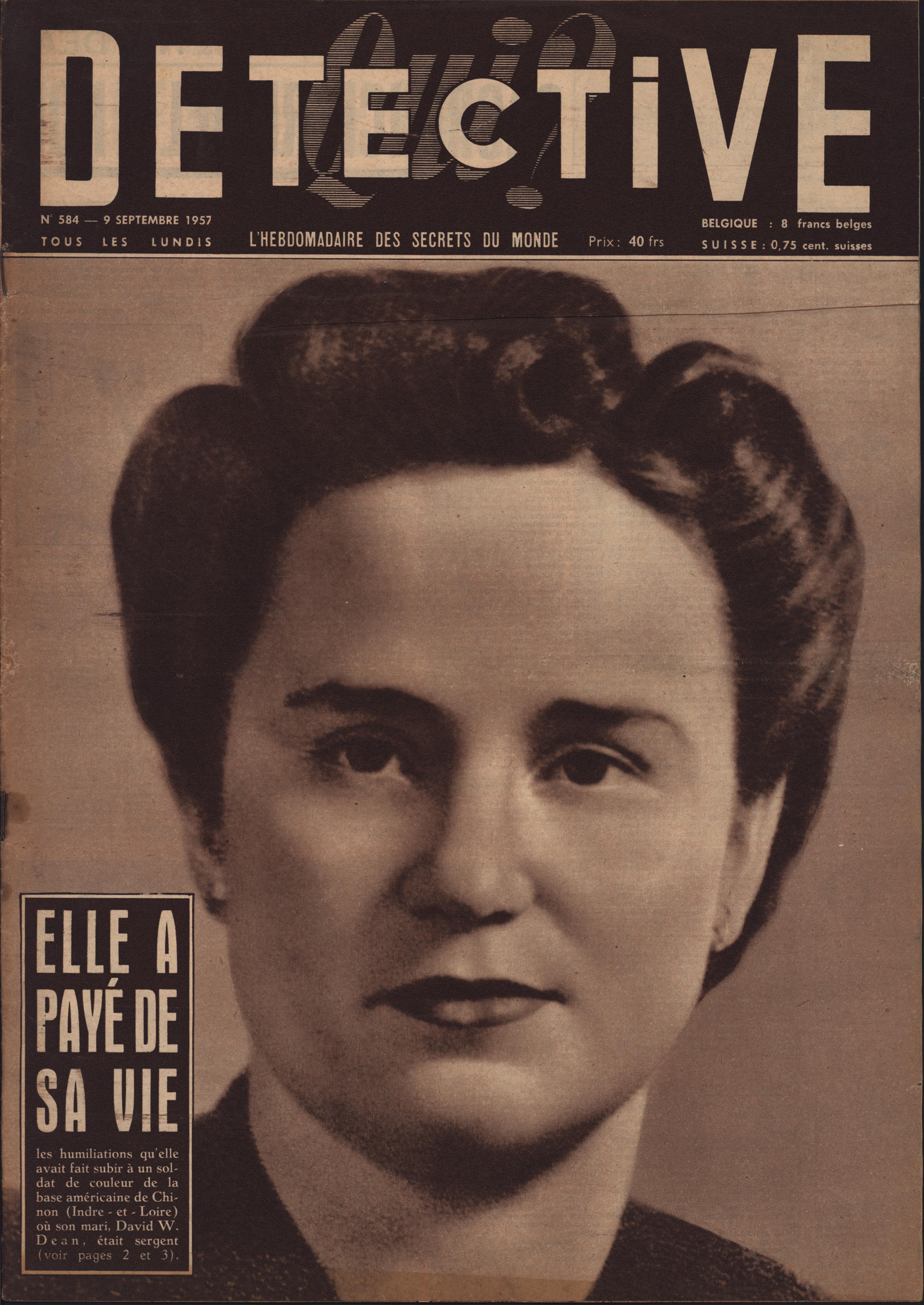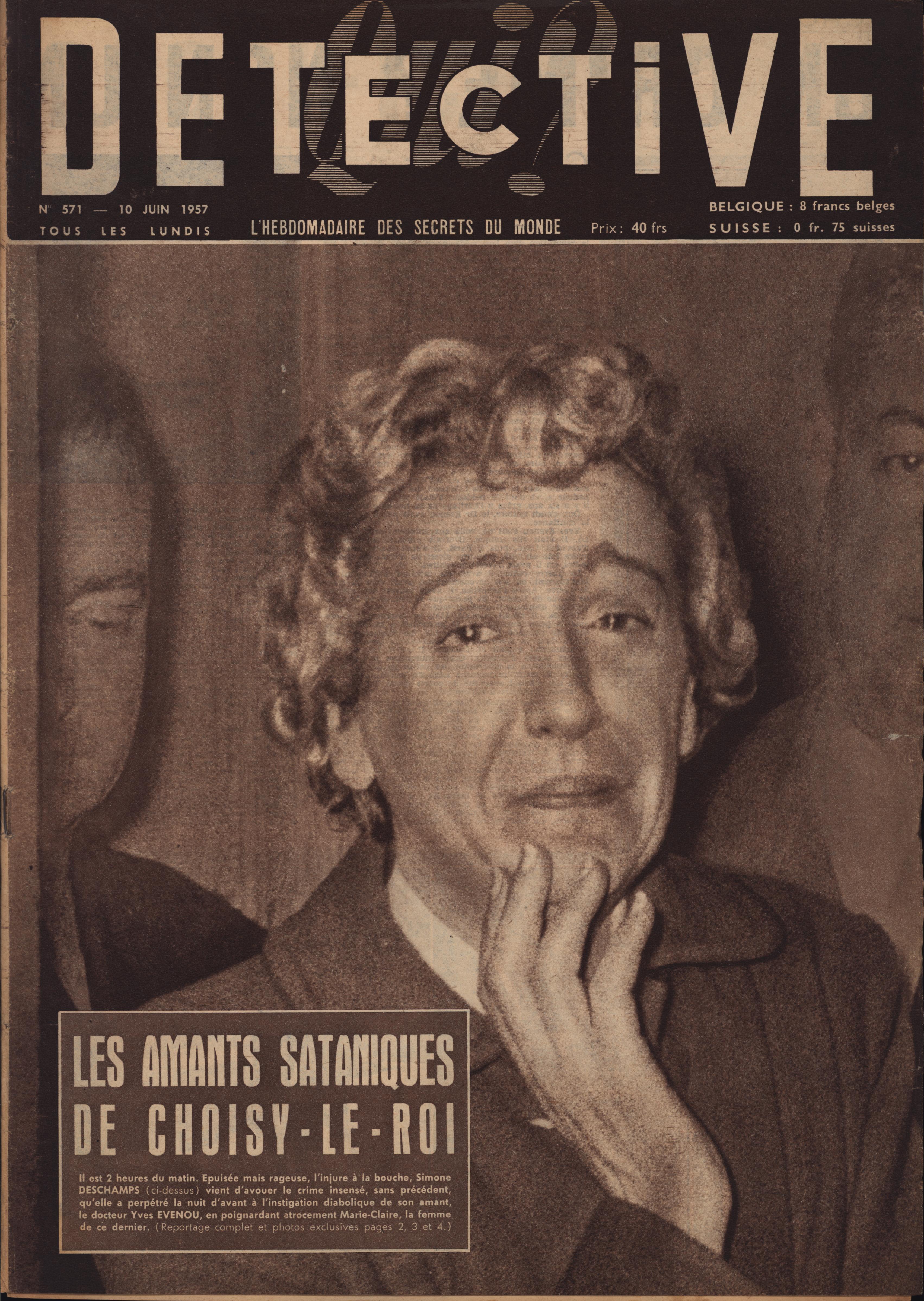 In 1946, rights to the title Détective were sold to the French Beyler group, who published it as Qui? Détective until 1958. In this and other galleries, we will present covers of the various incarnations of Détective as it changed title and style several times from the end of World War II until the present day. This gallery features issues of Qui? Détective from 1957. One of the striking features of this year’s covers is their almost exclusive domination by portraits — by people asking us to judge them, by others condemned, by the victimized. Because the back covers of Qui? Détective featured panel cartoons rather than photographs, we have not included them.