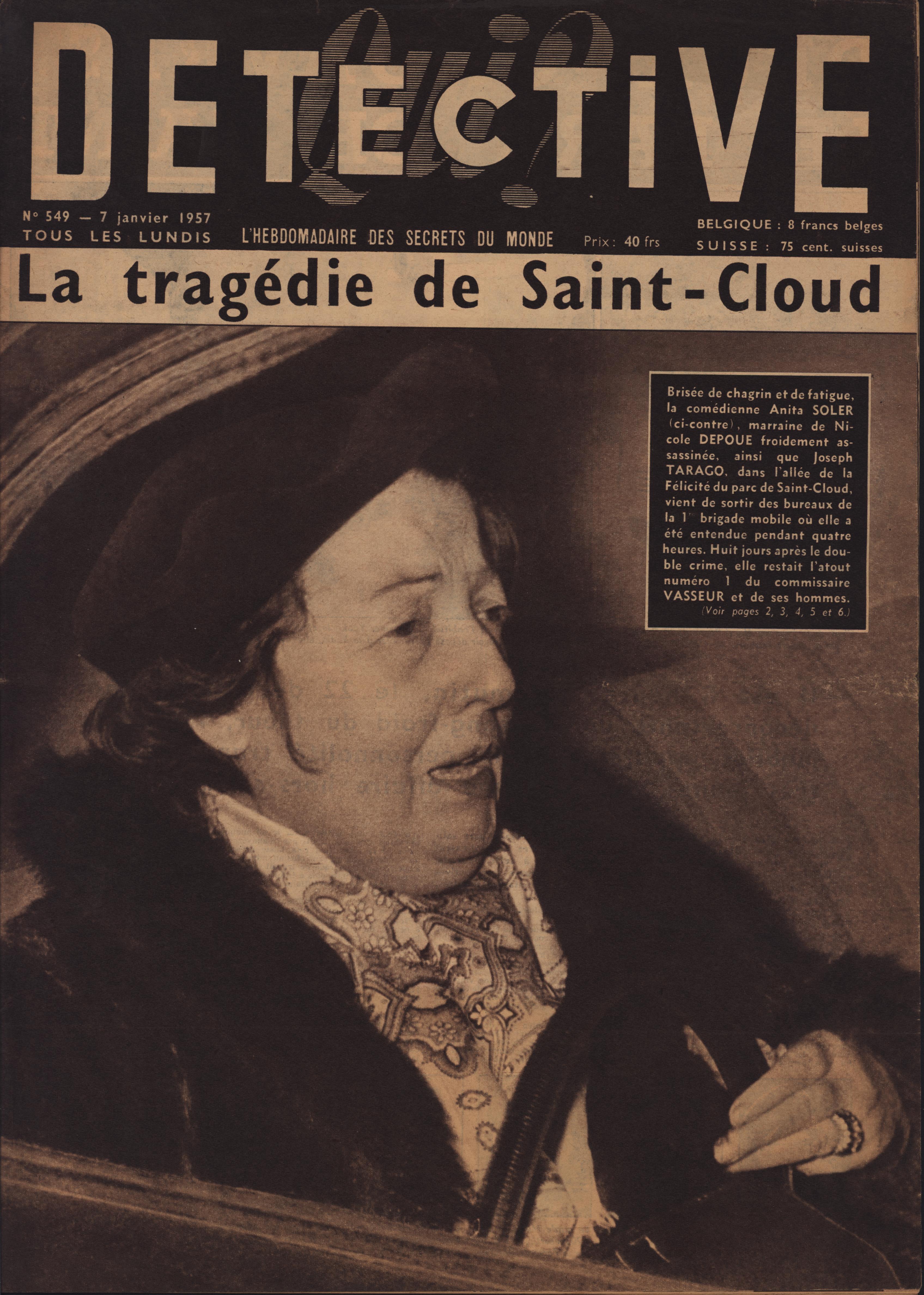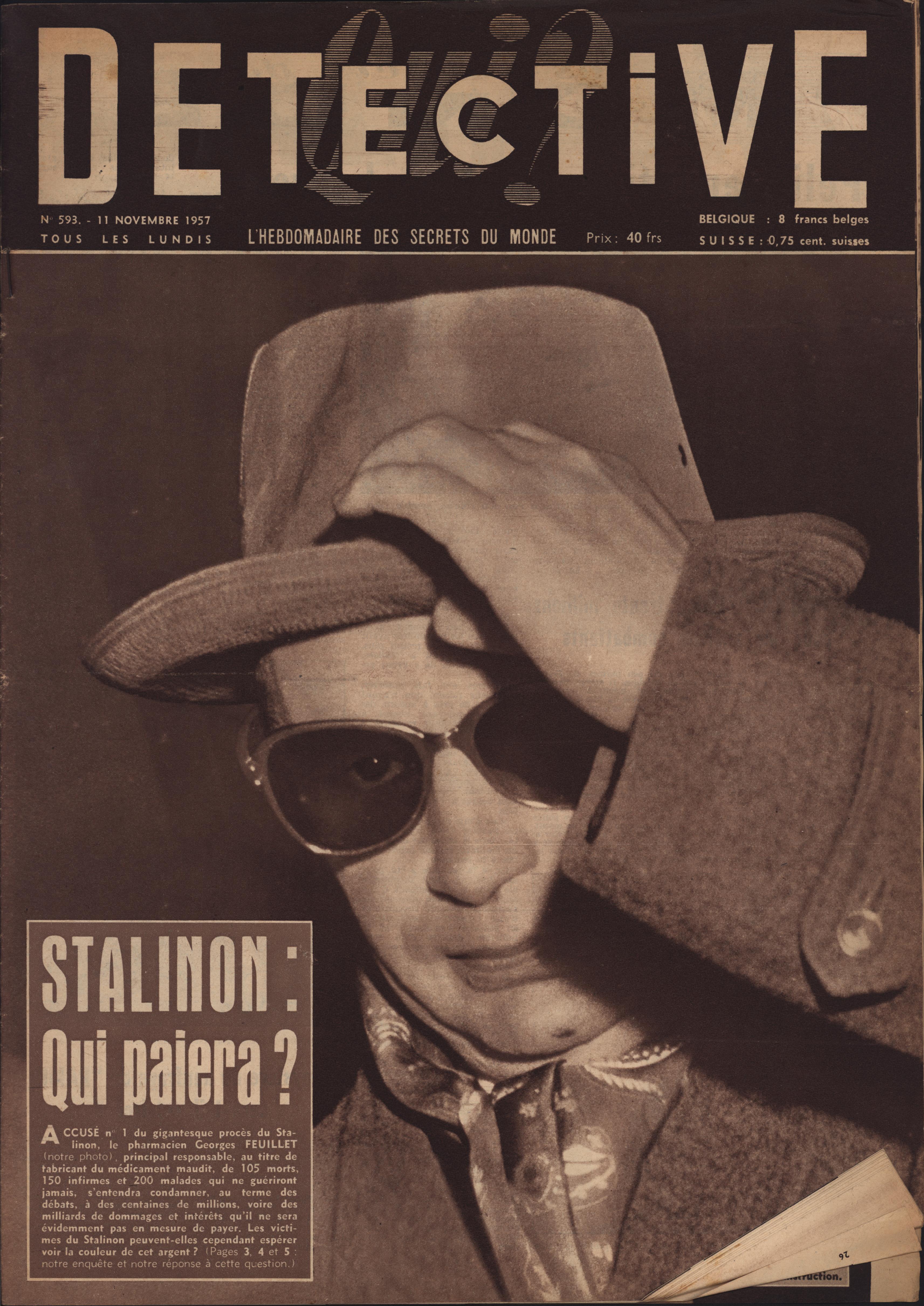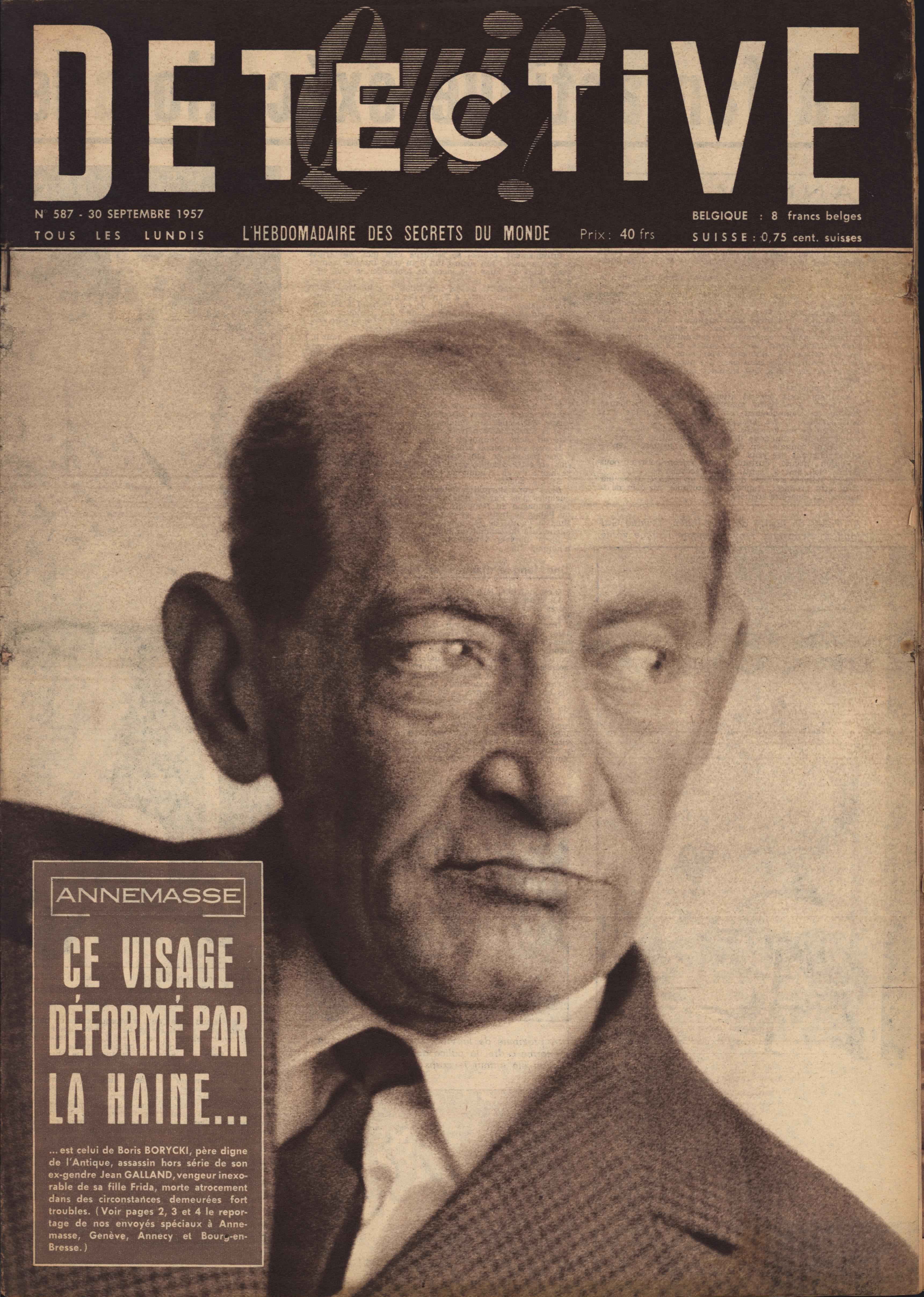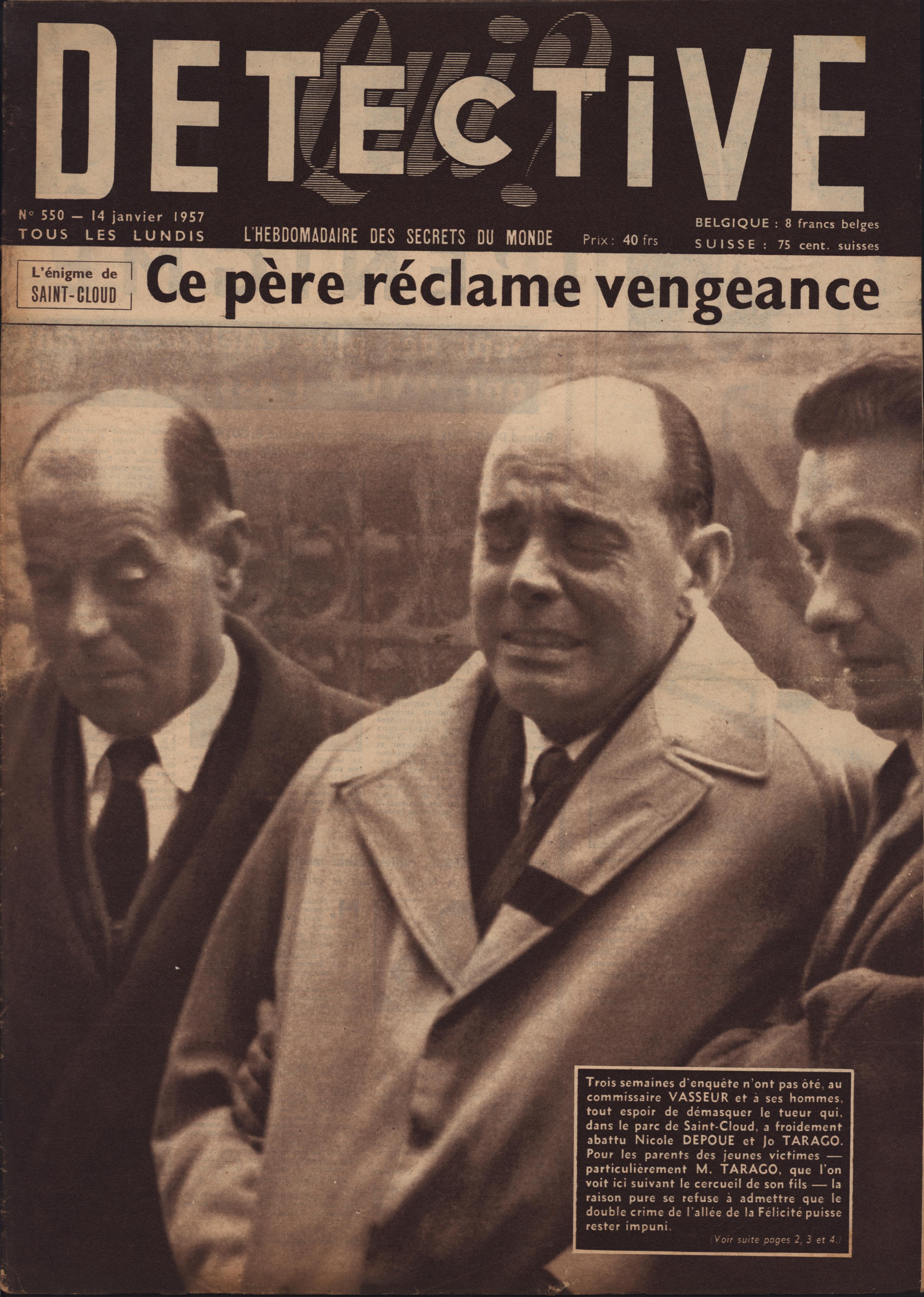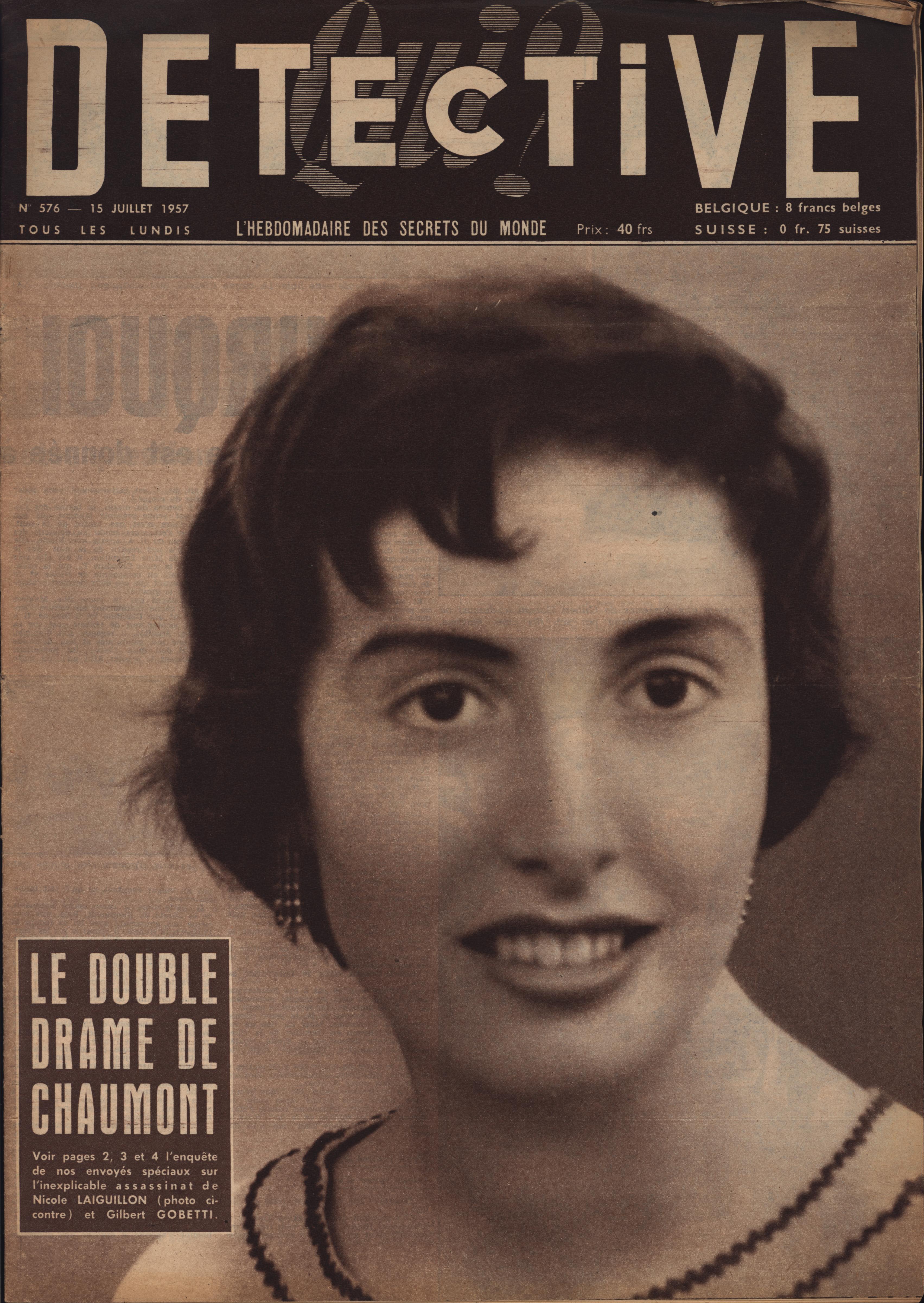In 1946, rights to the title Détective were sold to the French Beyler group, who published it as Qui? Détective until 1958. In this and other galleries, we will present covers of the various incarnations of Détective as it changed title and style several times from the end of World War II until the present day. This gallery features issues of Qui? Détective from 1957. One of the striking features of this year’s covers is their almost exclusive domination by portraits — by people asking us to judge them, by others condemned, by the victimized. Because the back covers of Qui? Détective featured panel cartoons rather than photographs, we have not included them.