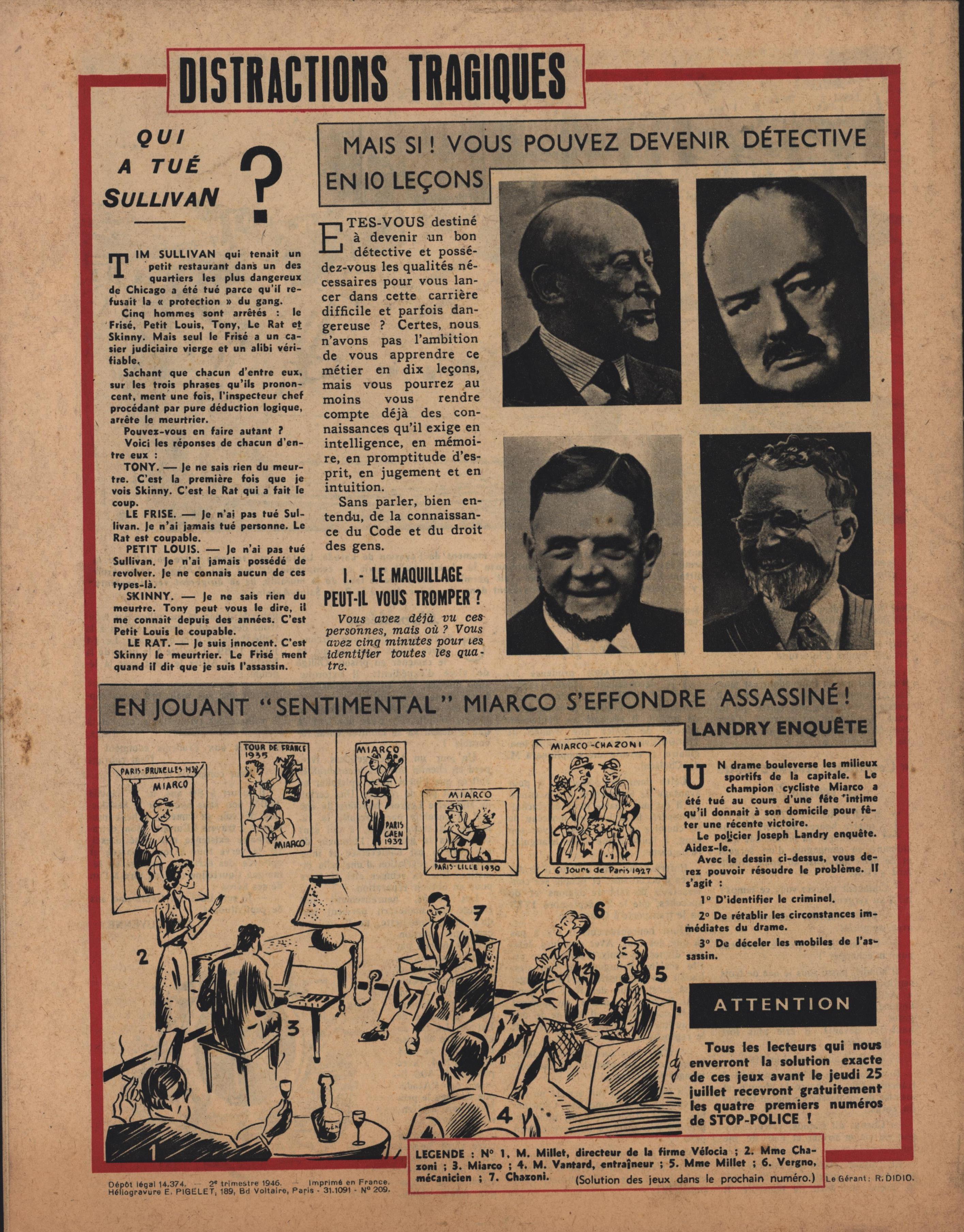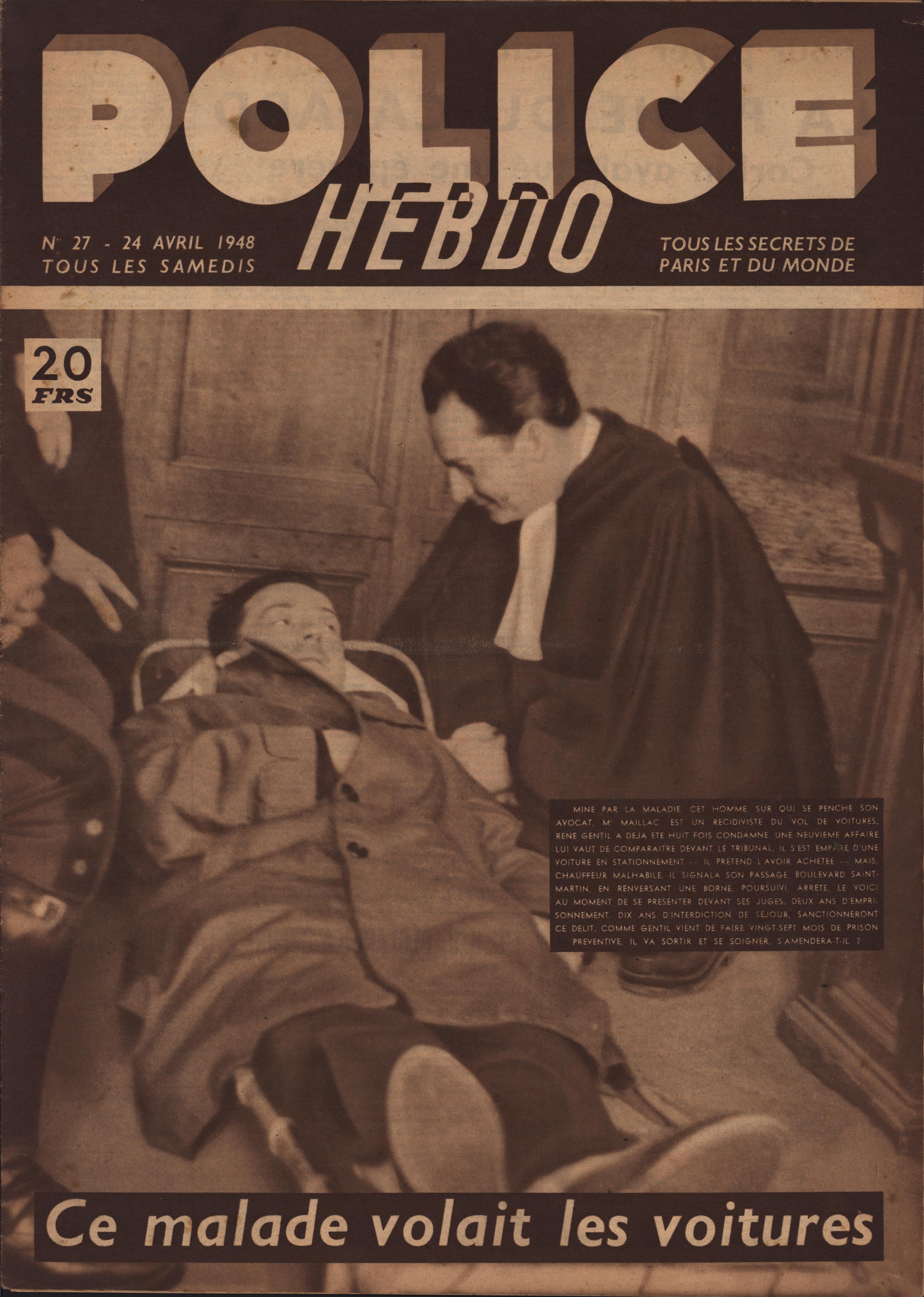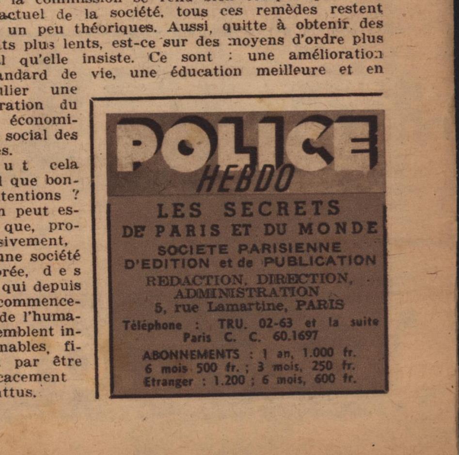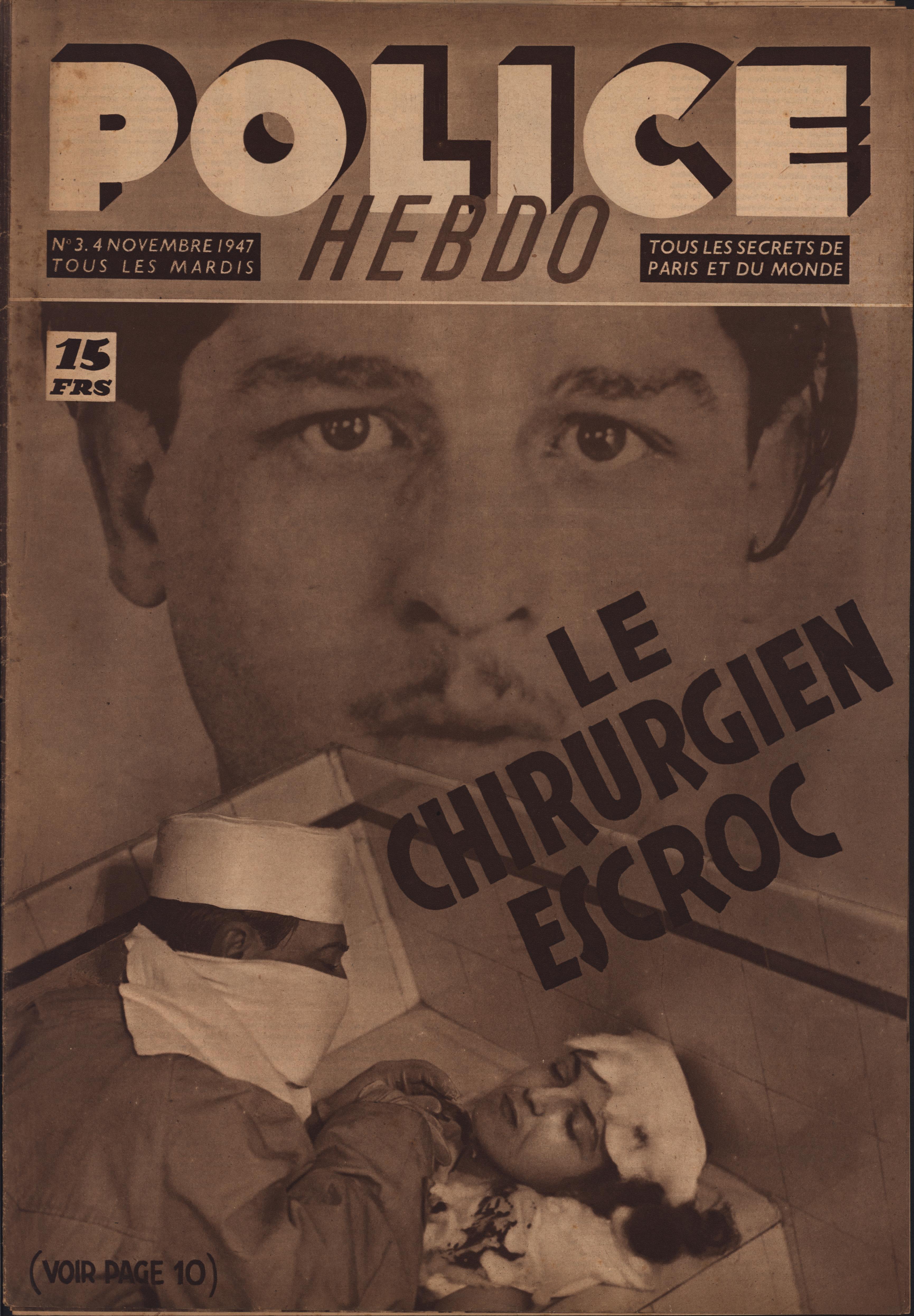 In the immediate post-war period, while Qui? Détective continued the legacy of the pre-war Détective, albeit under new ownership, other crime-oriented papers emerged in France, most of them short-lived. Here we see issues of Stop Police, published in 1946-1947, Enquêtes: le grand hebdomadaire policier, from 1947 and Police Hebdo. According to the BIBLIOGRAPHIE DE L’HISTOIRE DE LA JUSTICE FRANÇAISE (1789-2011) on the Criminocorpus site, Police Hebdo was published only in 1947 and 1948. It was roughly the same size and format as the post-war Qui? Détective.