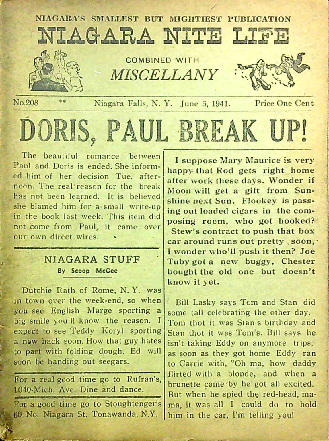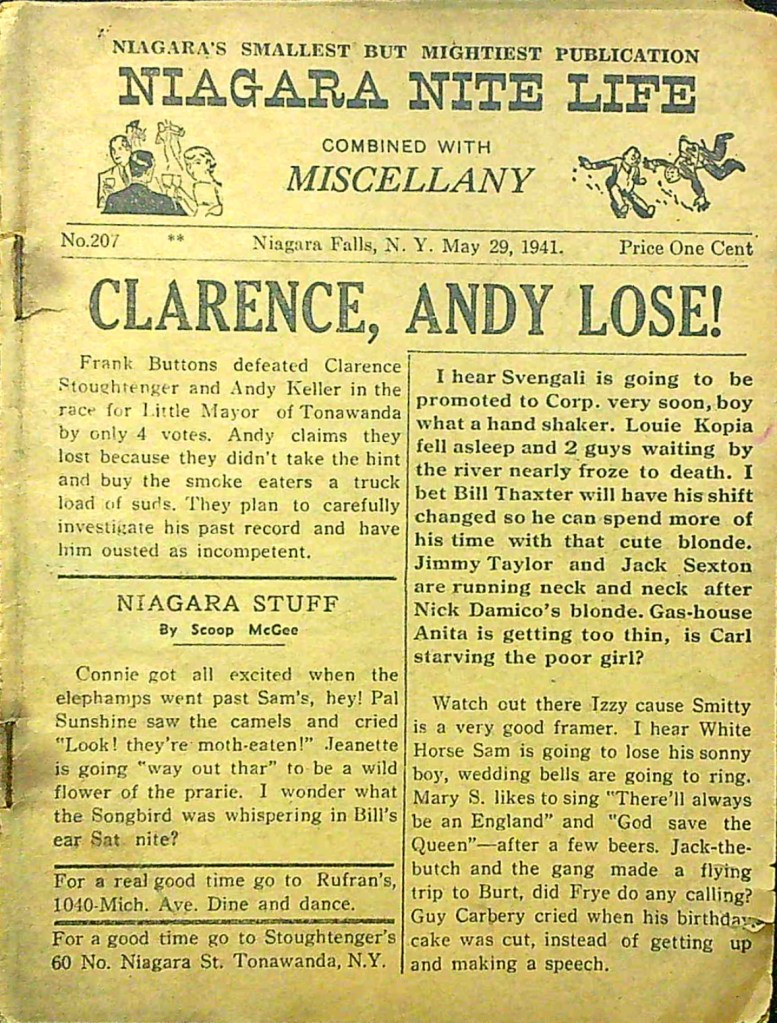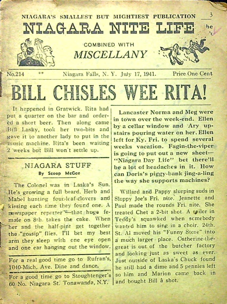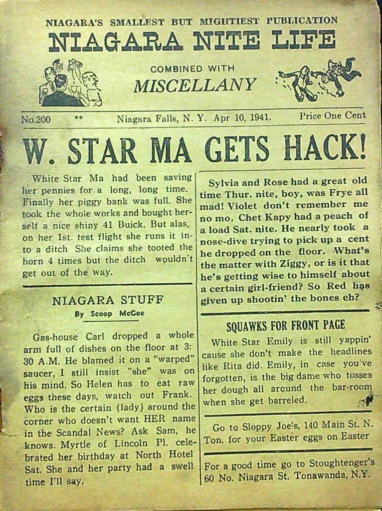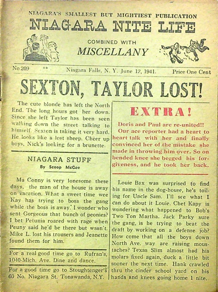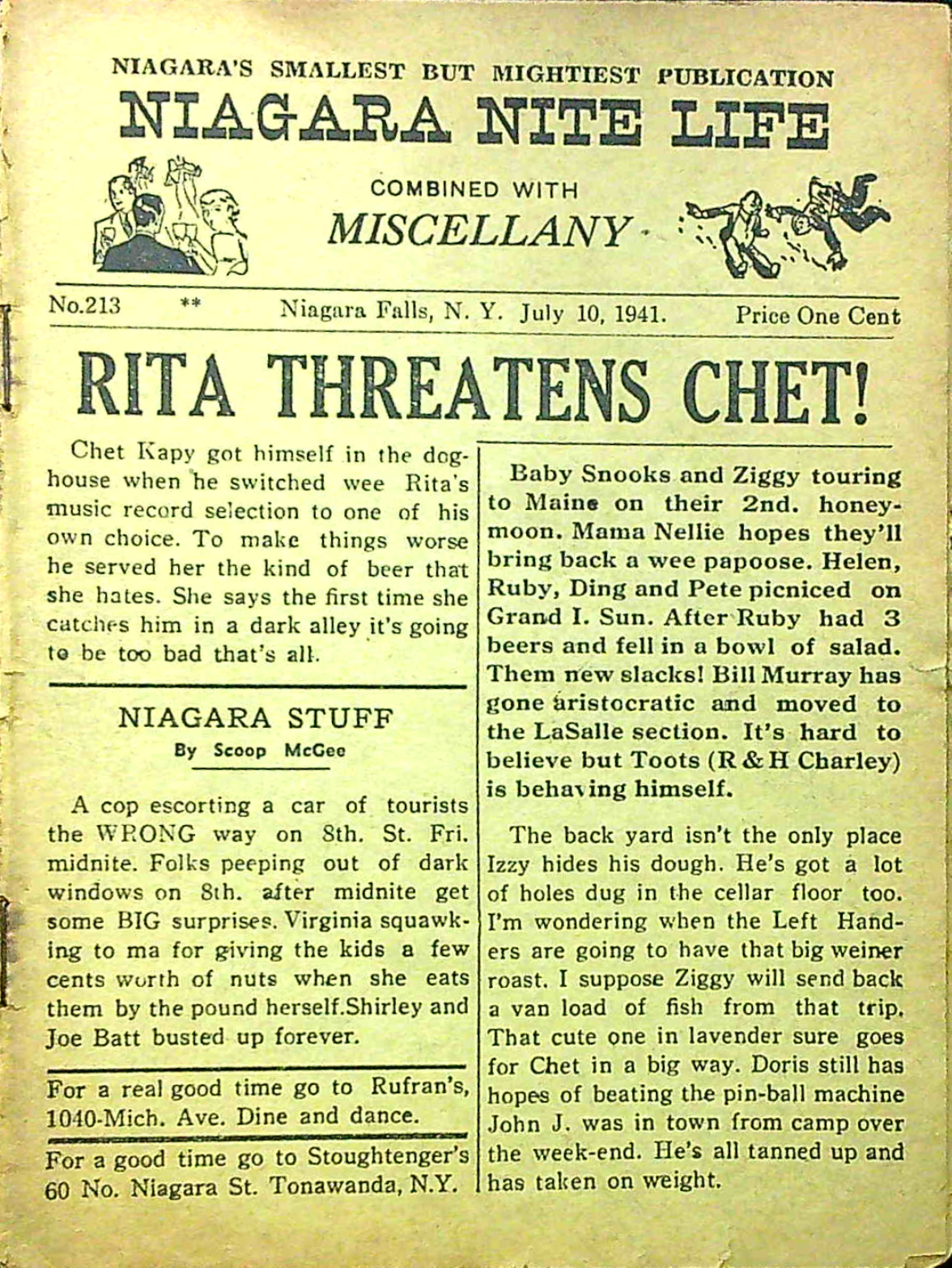 Published every thursday by “Miscellany Publishing Co., P. O. Box 751, Niagara Falls, N. Y.,” the pocket-sized Niagara Nite Life contained an assortment of local news, jokes and advertisements (mostly for restaurants and hotels.) The front page offered gossipy headlines about area residents. Shorter bits of news about locals were scattered through all 24 pages of each issue.