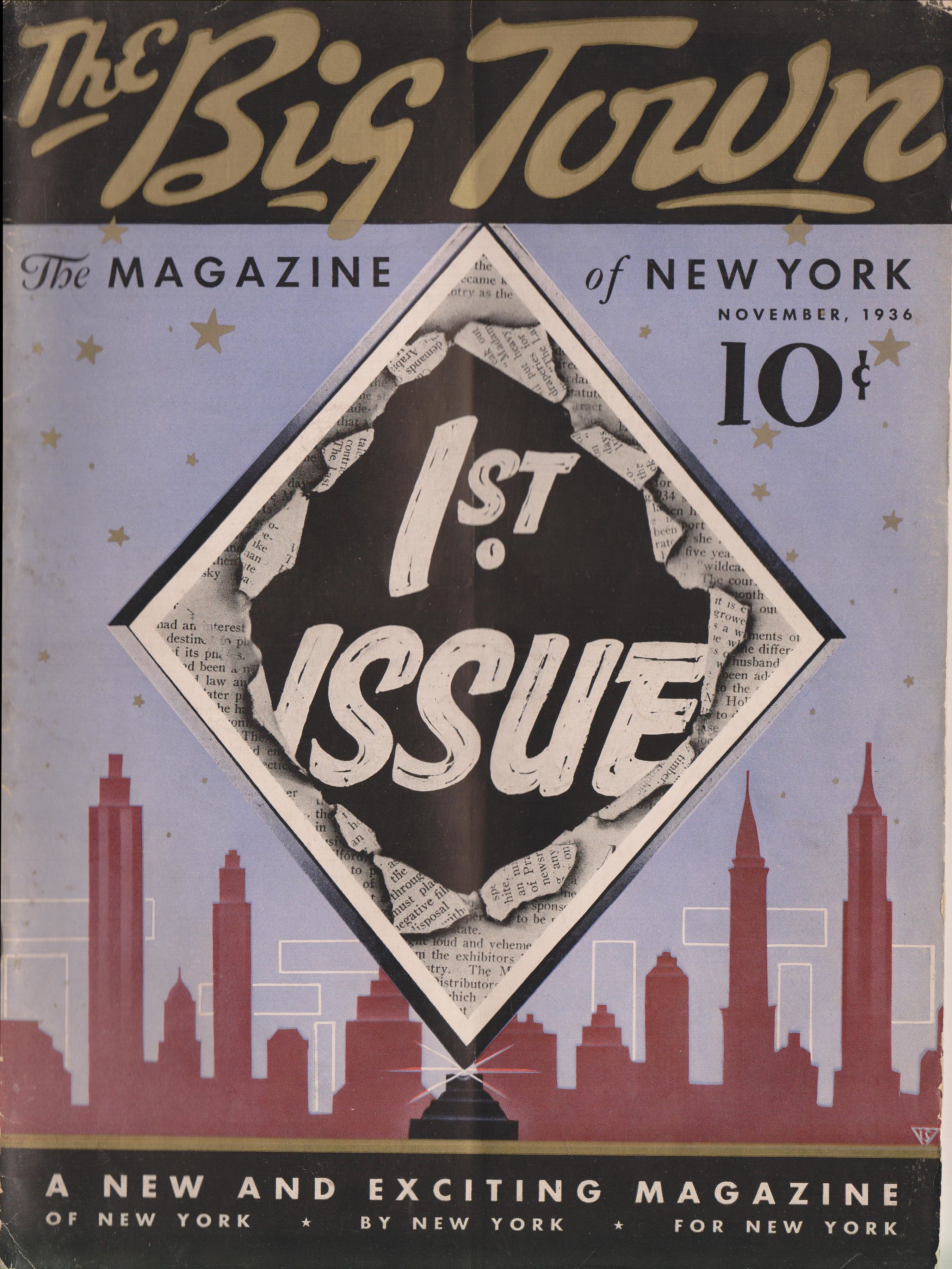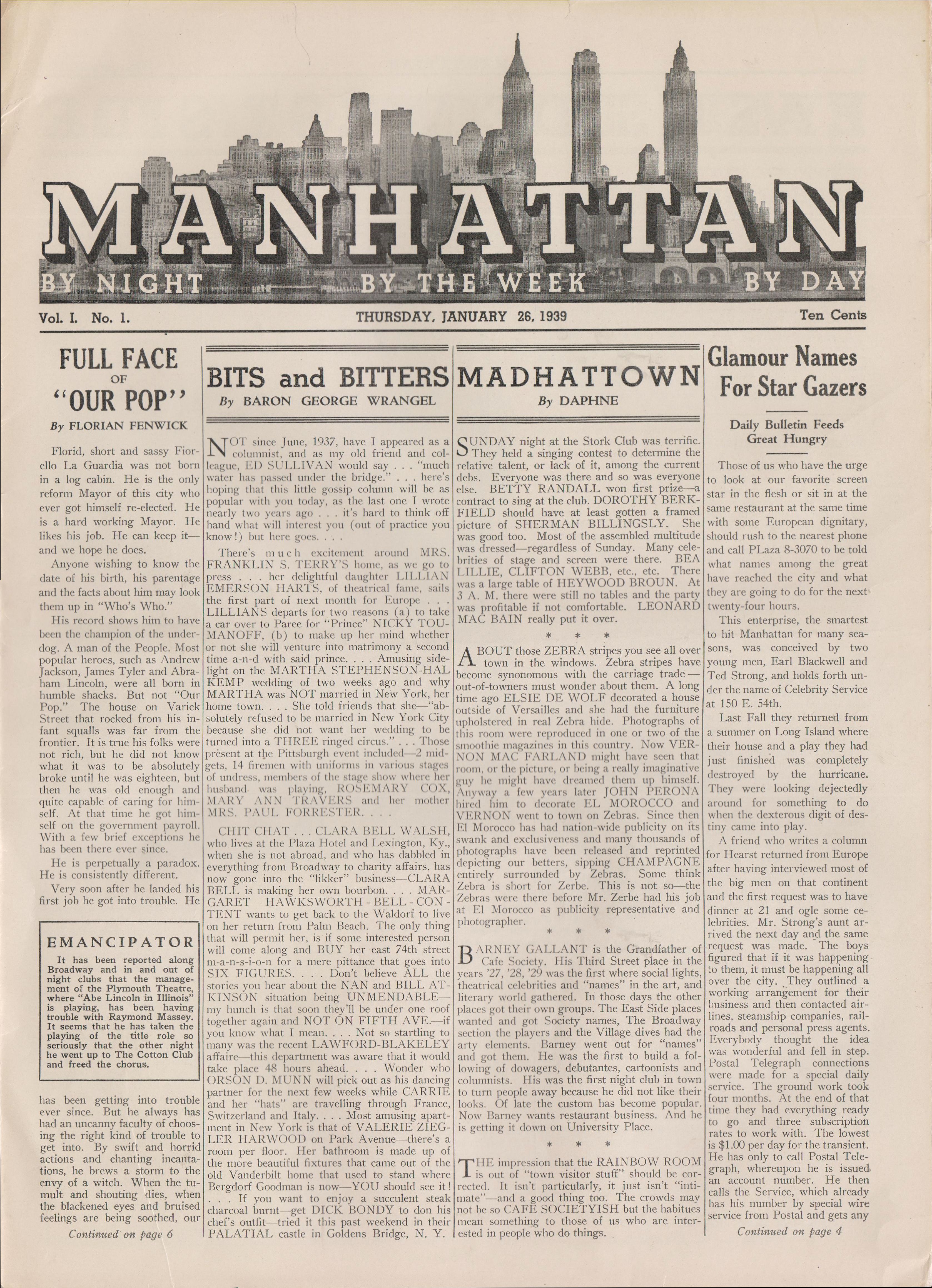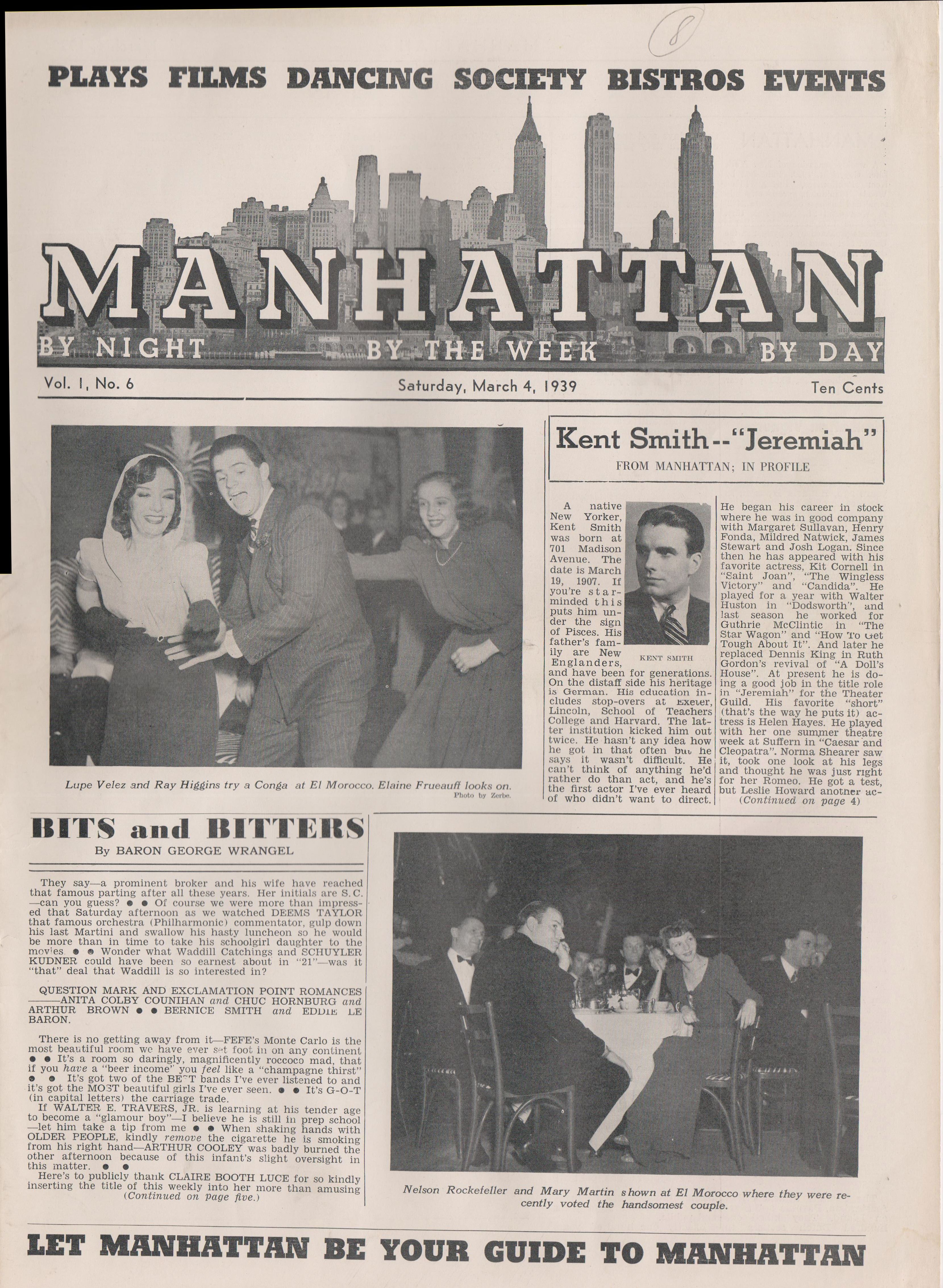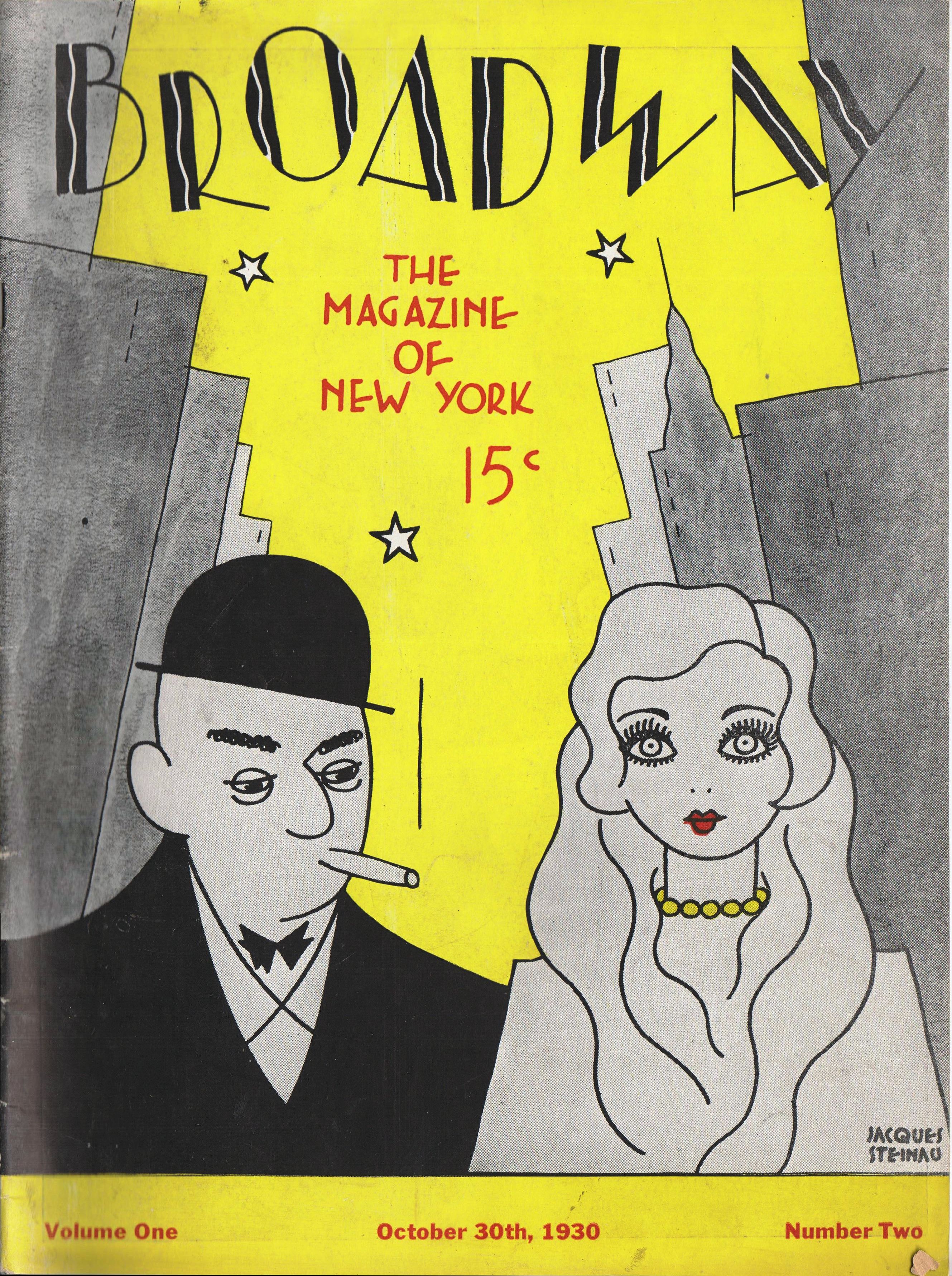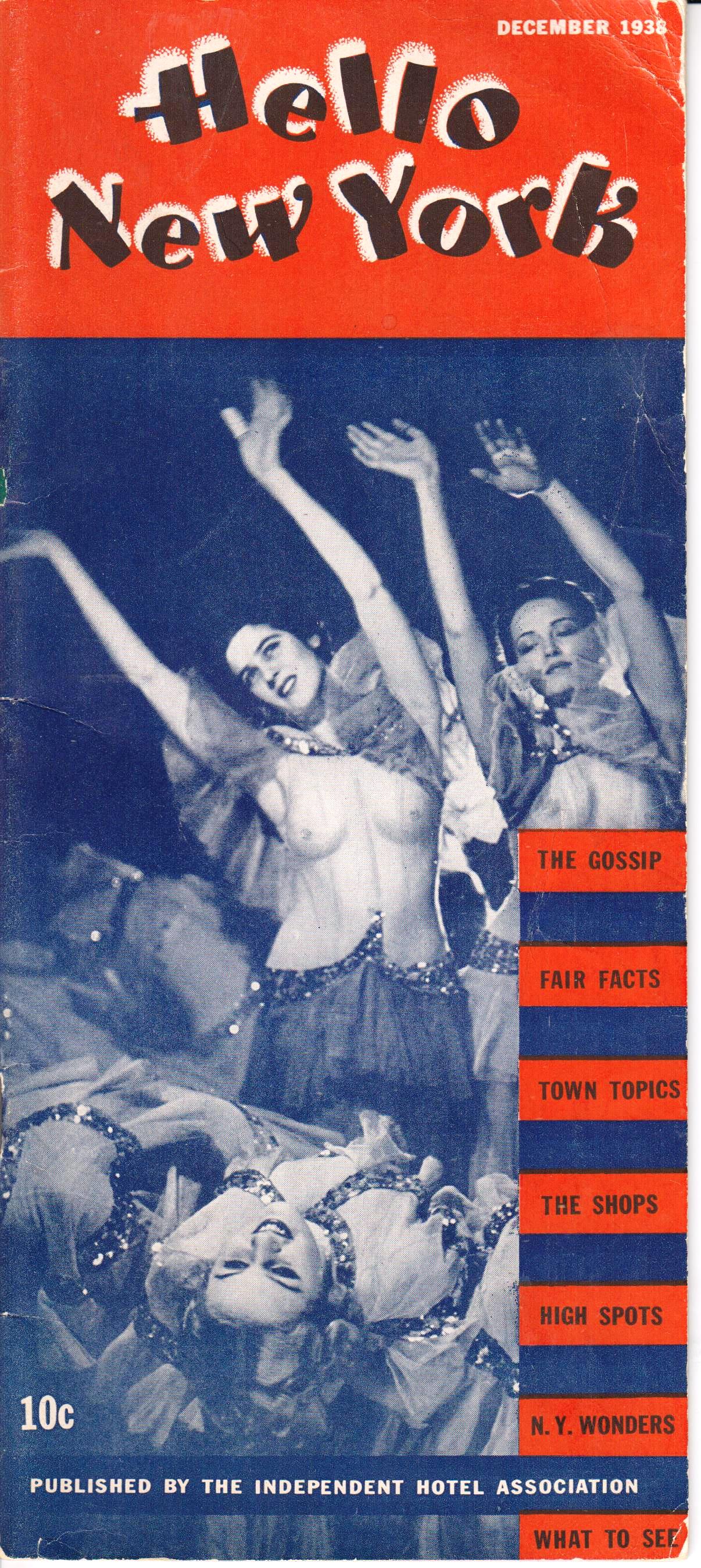 Like other large cities, New York City has seen the publication of a wide variety of magazines aimed at people seeking information on its night life and entertainment. Some of these magazines have been tourist guides, with information organized by category (restaurants, theatres, nightclubs) and a tone of helpful instruction to the visitor. Others have sought their readers among city-dwellers and offered an insider’s perspective, with backstage gossip and reviews which presume a reader’s familiarity with the ongoing stream of new plays, concerts and other events. In the precarious publishing climate of the 1930s, a great many of these magazines were launched. Few of those shown here survived more than a few years.