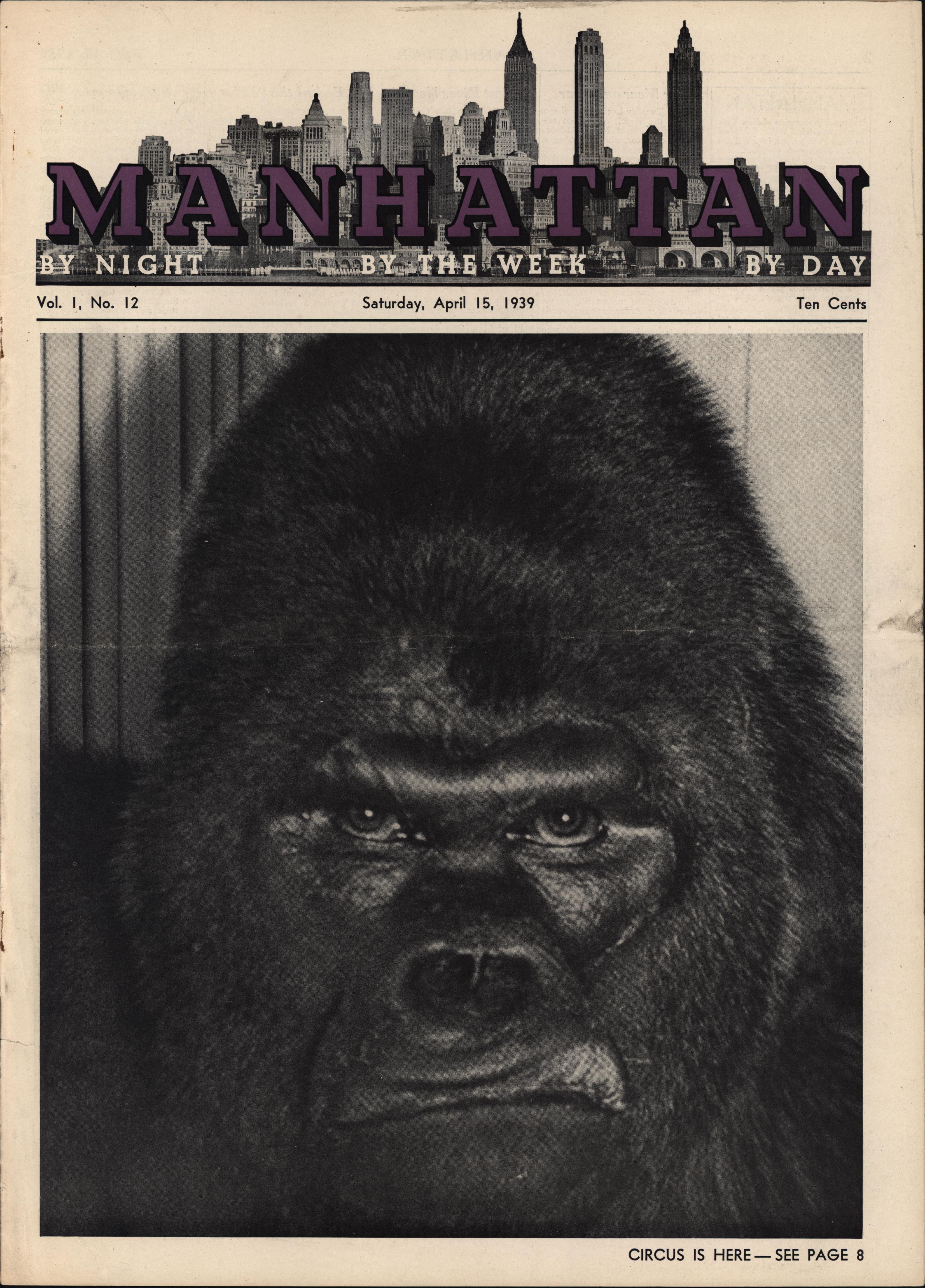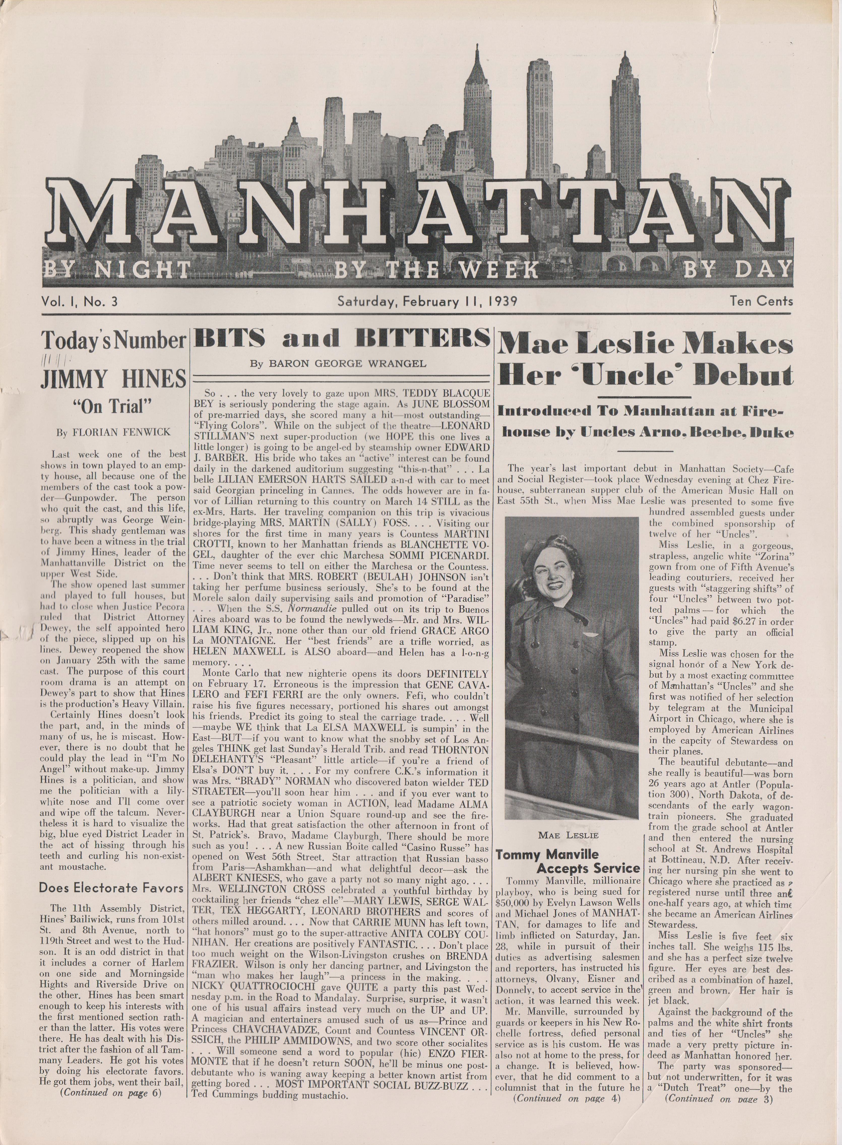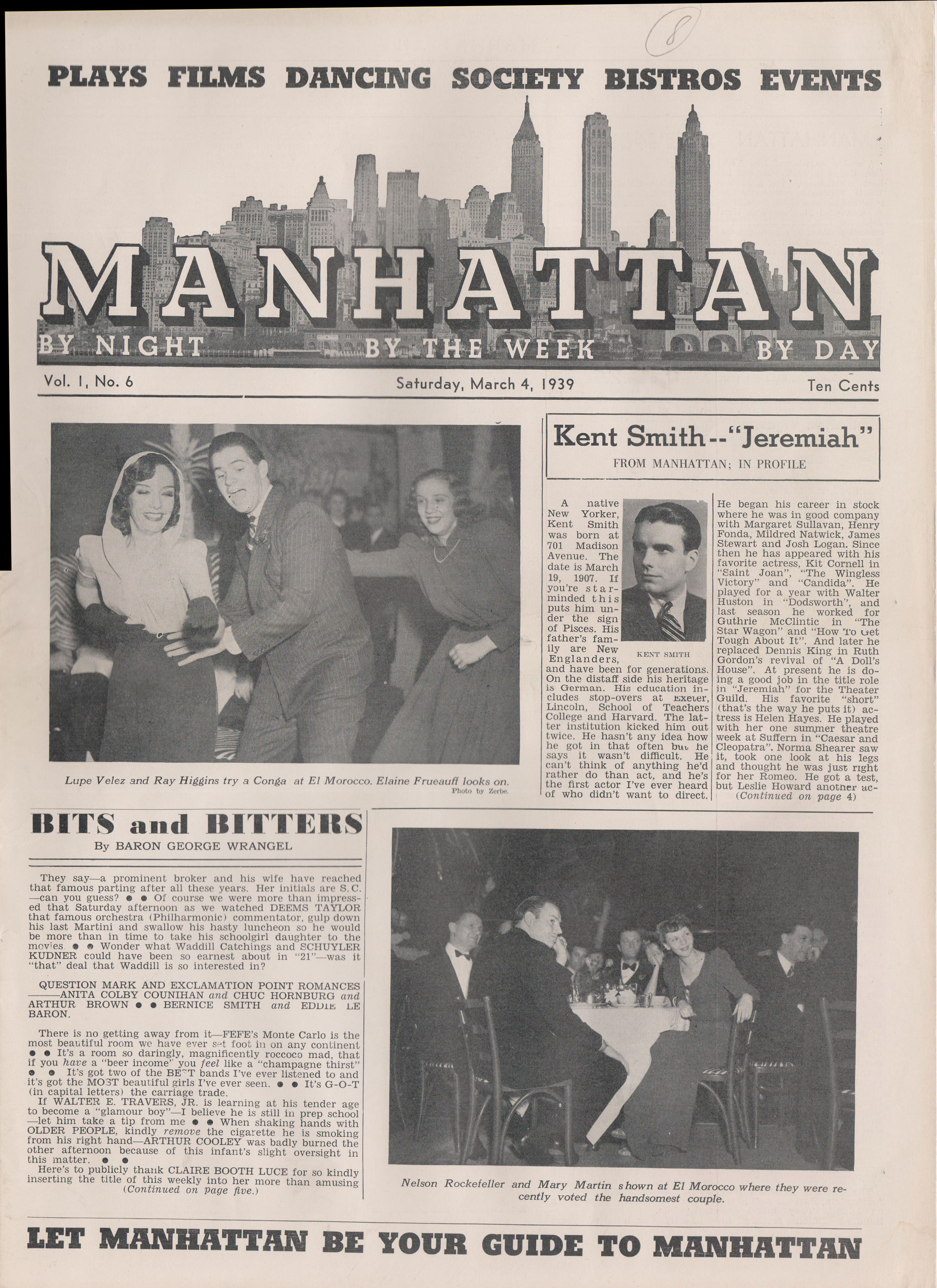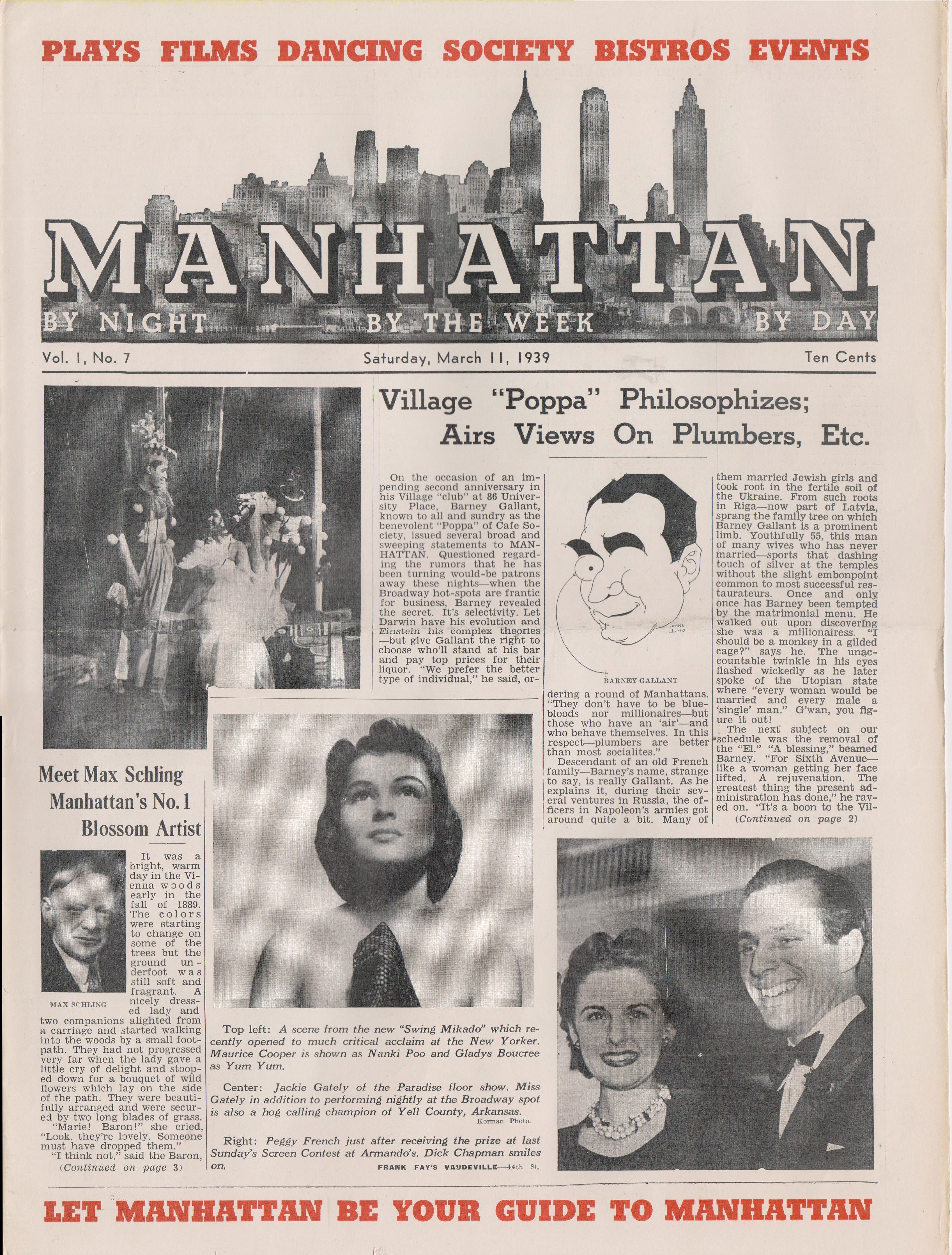 Like other large cities, New York City has seen the publication of a wide variety of magazines aimed at people seeking information on its night life and entertainment. Some of these magazines have been tourist guides, with information organized by category (restaurants, theatres, nightclubs) and a tone of helpful instruction to the visitor. Others have sought their readers among city-dwellers and offered an insider’s perspective, with backstage gossip and reviews which presume a reader’s familiarity with the ongoing stream of new plays, concerts and other events. In the precarious publishing climate of the 1930s, a great many of these magazines were launched. Few of those shown here survived more than a few years.