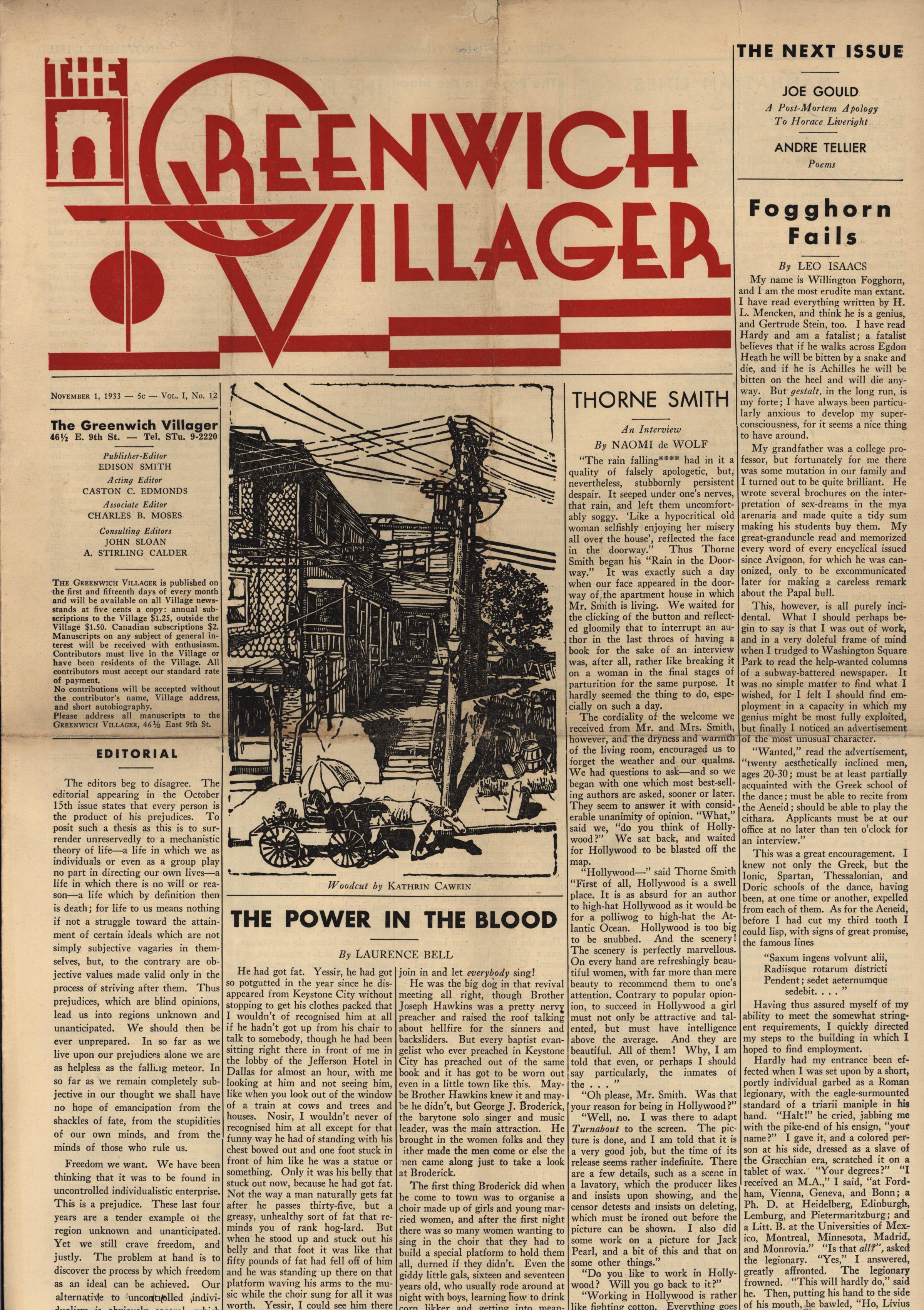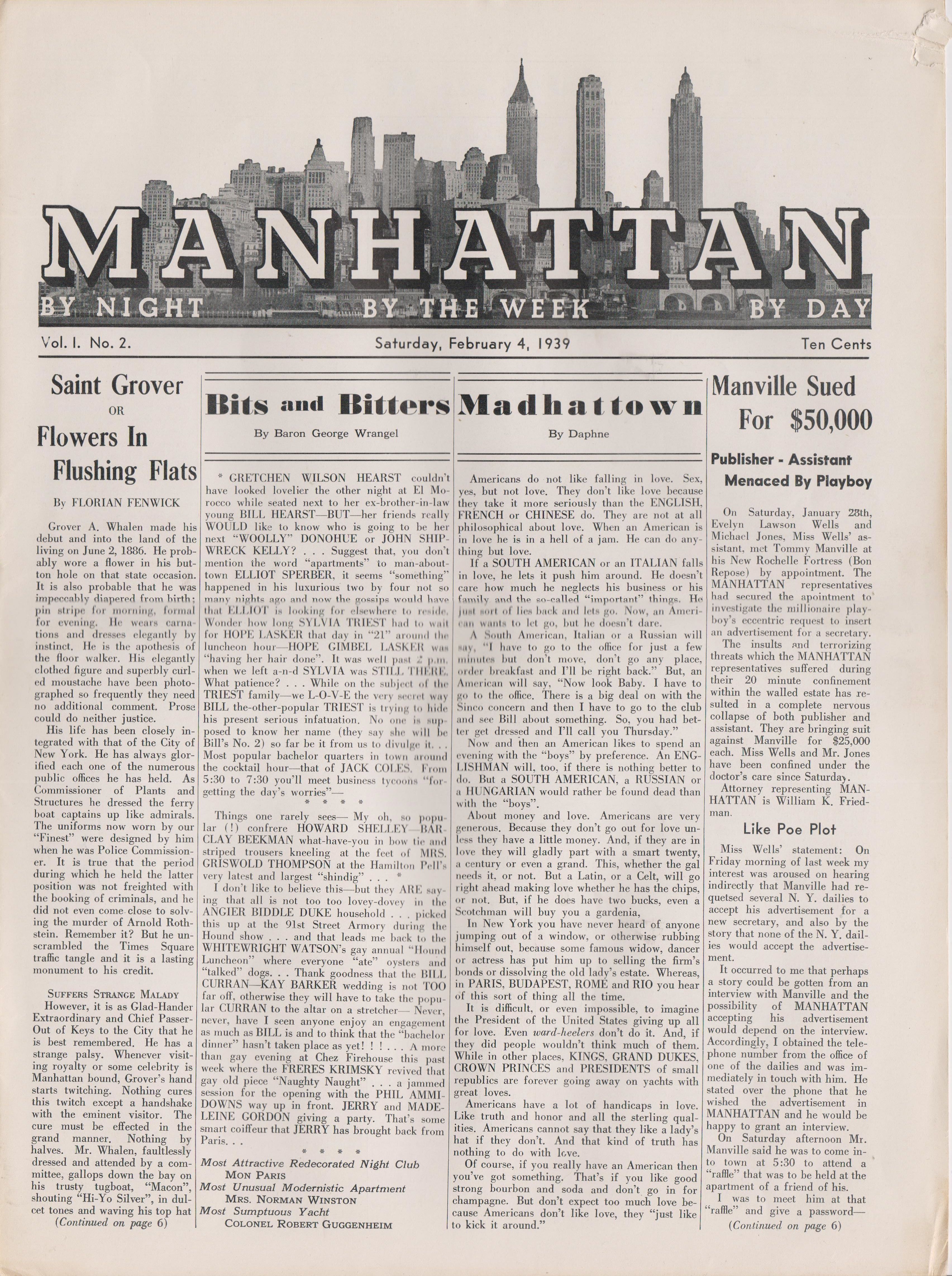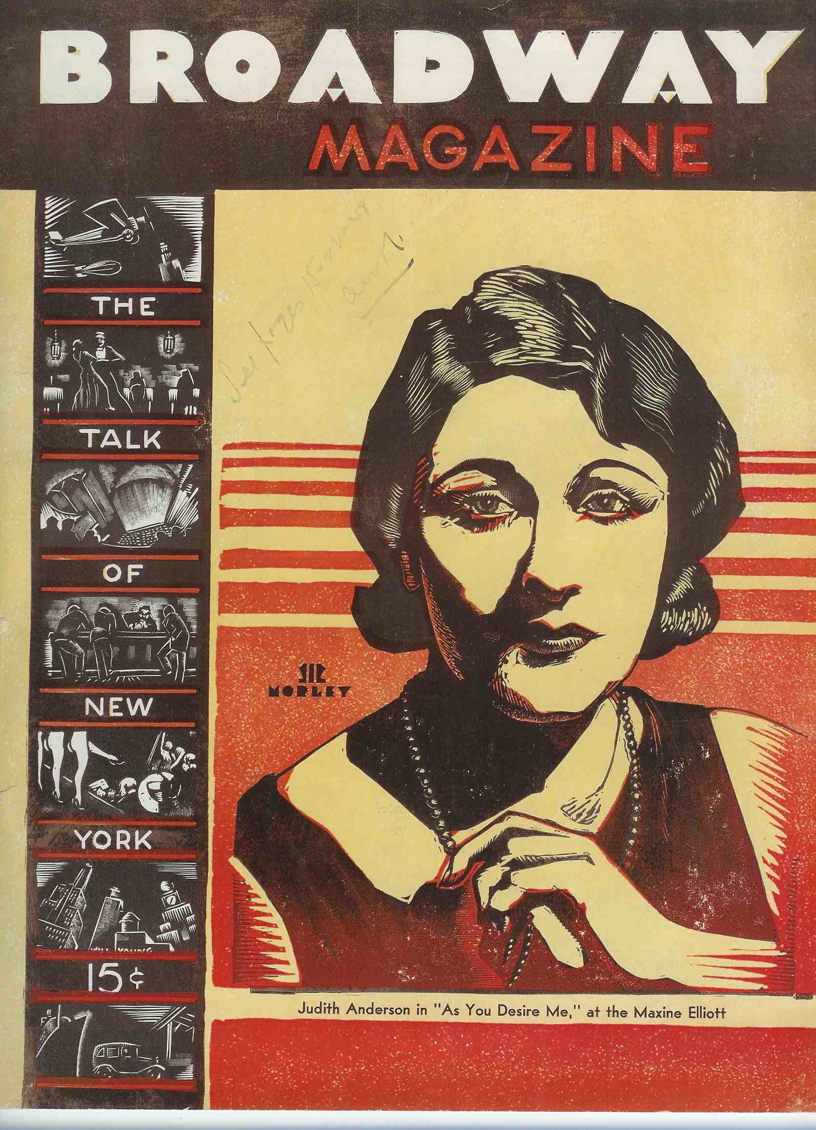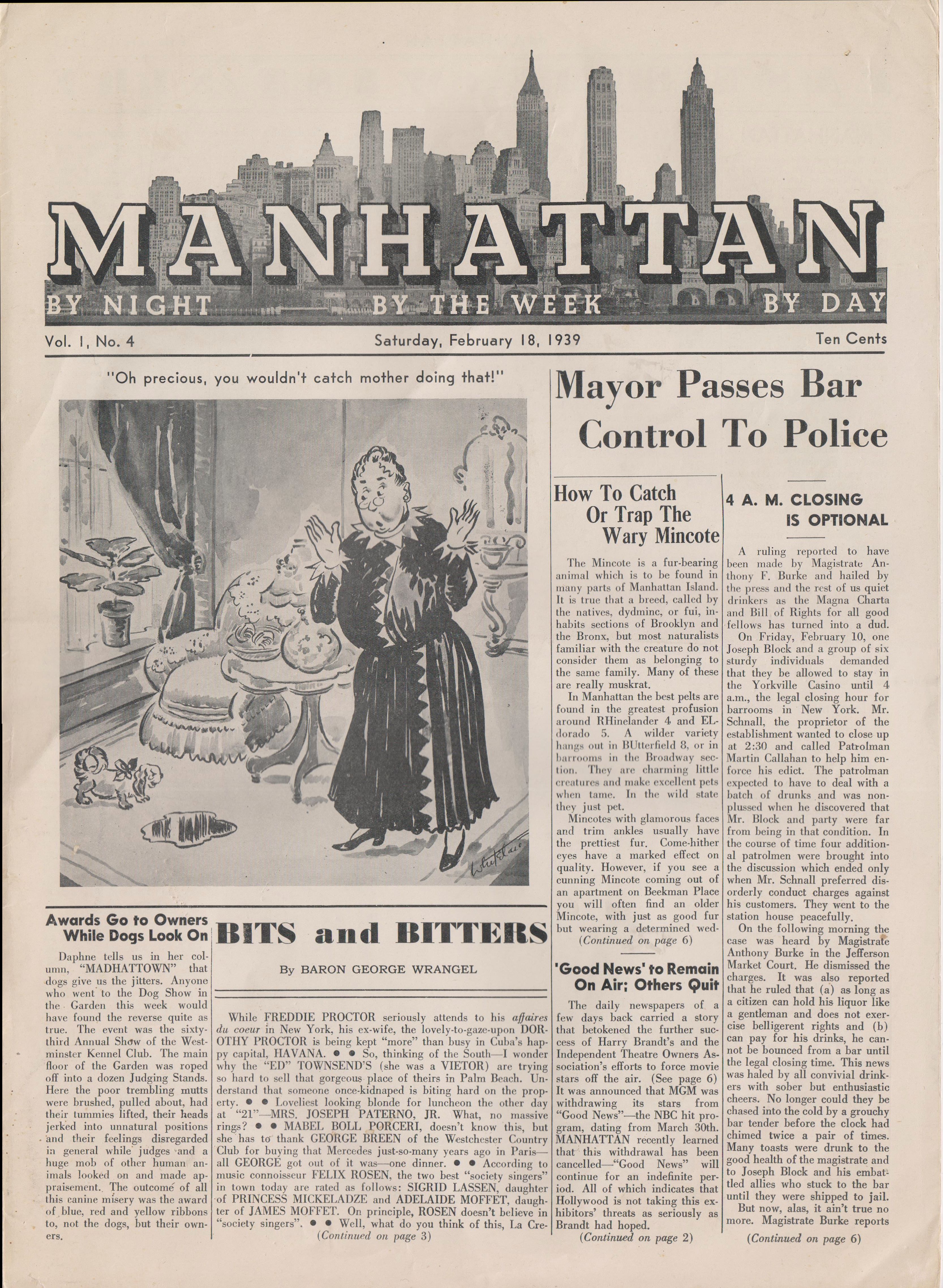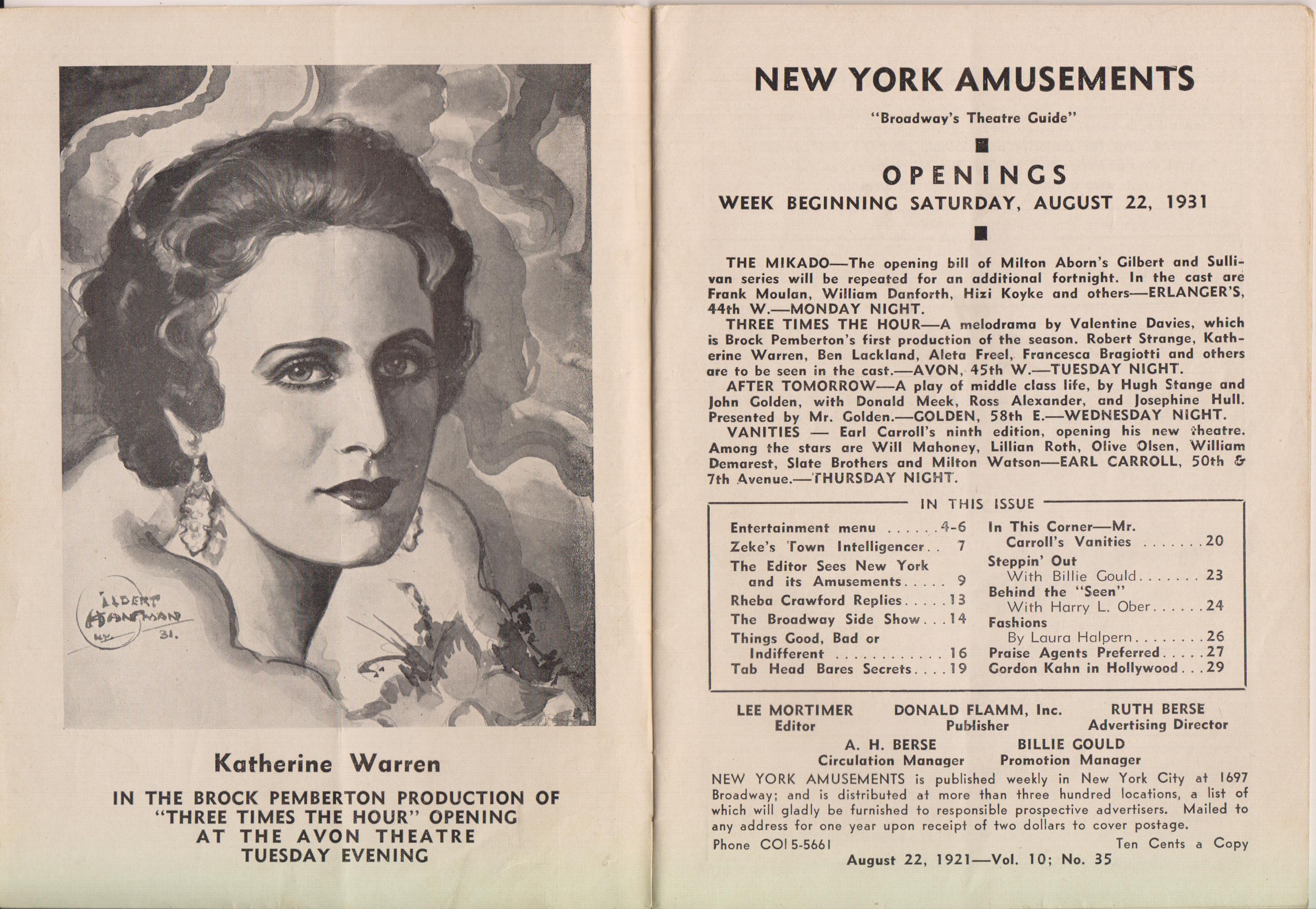 Like other large cities, New York City has seen the publication of a wide variety of magazines aimed at people seeking information on its night life and entertainment. Some of these magazines have been tourist guides, with information organized by category (restaurants, theatres, nightclubs) and a tone of helpful instruction to the visitor. Others have sought their readers among city-dwellers and offered an insider’s perspective, with backstage gossip and reviews which presume a reader’s familiarity with the ongoing stream of new plays, concerts and other events. In the precarious publishing climate of the 1930s, a great many of these magazines were launched. Few of those shown here survived more than a few years.